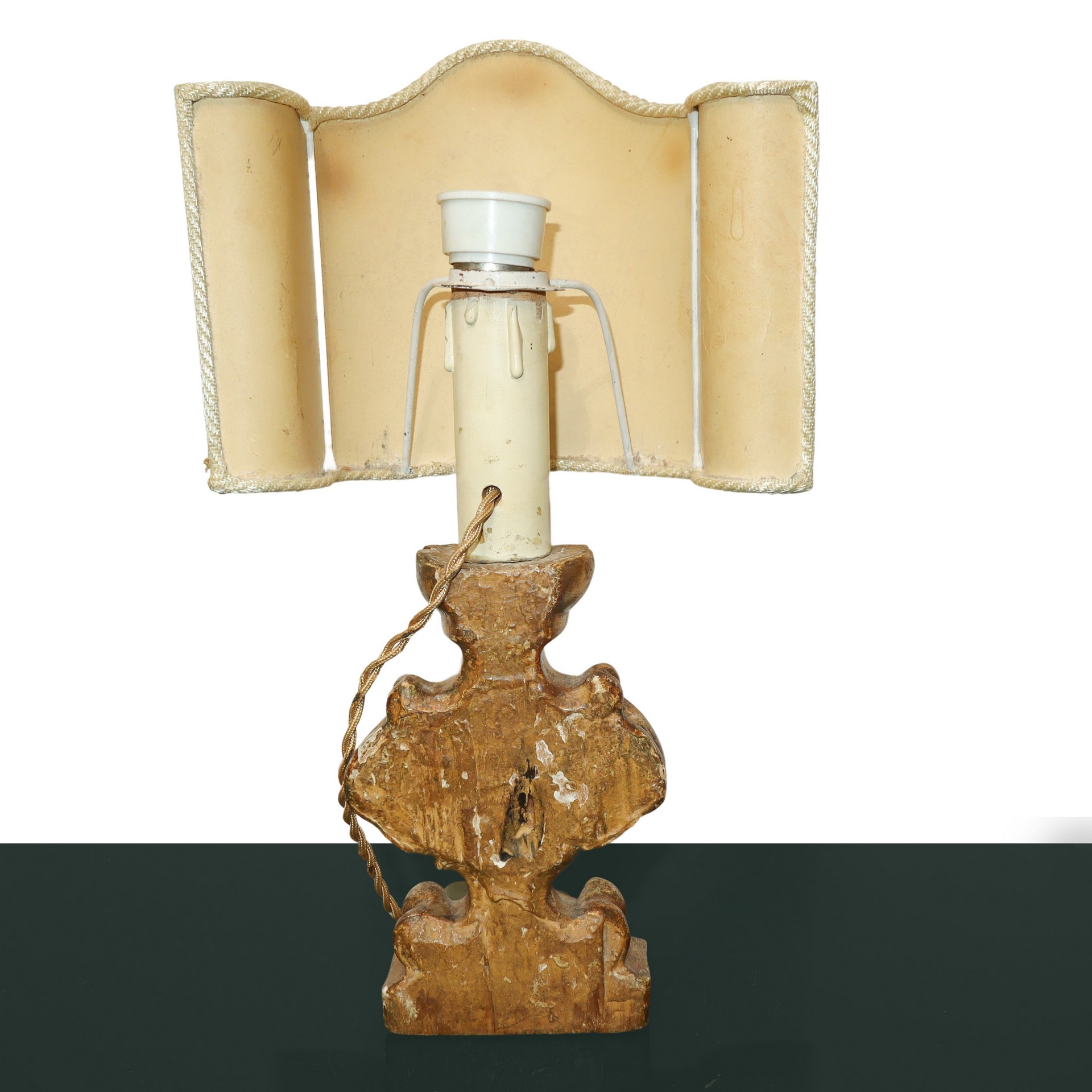 Lotto 117 | Piccolo lume in legno dorato con ventolina in tessuto, 19° secolo
