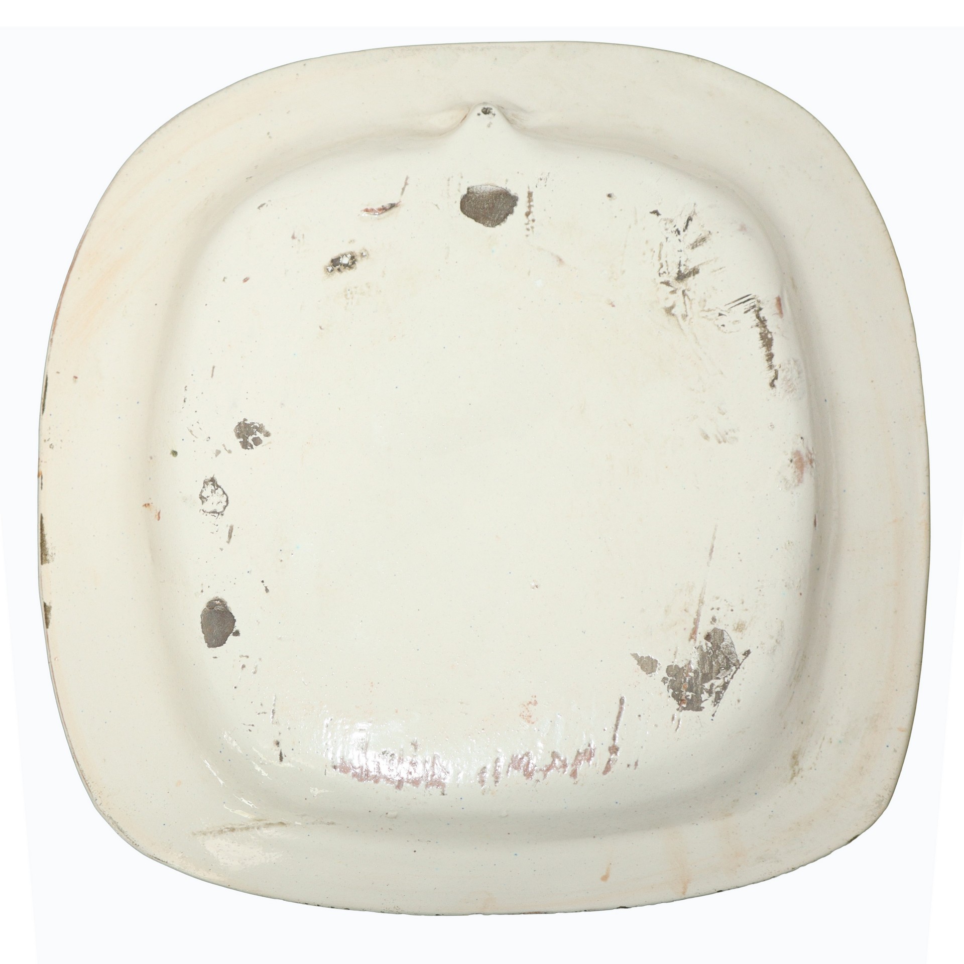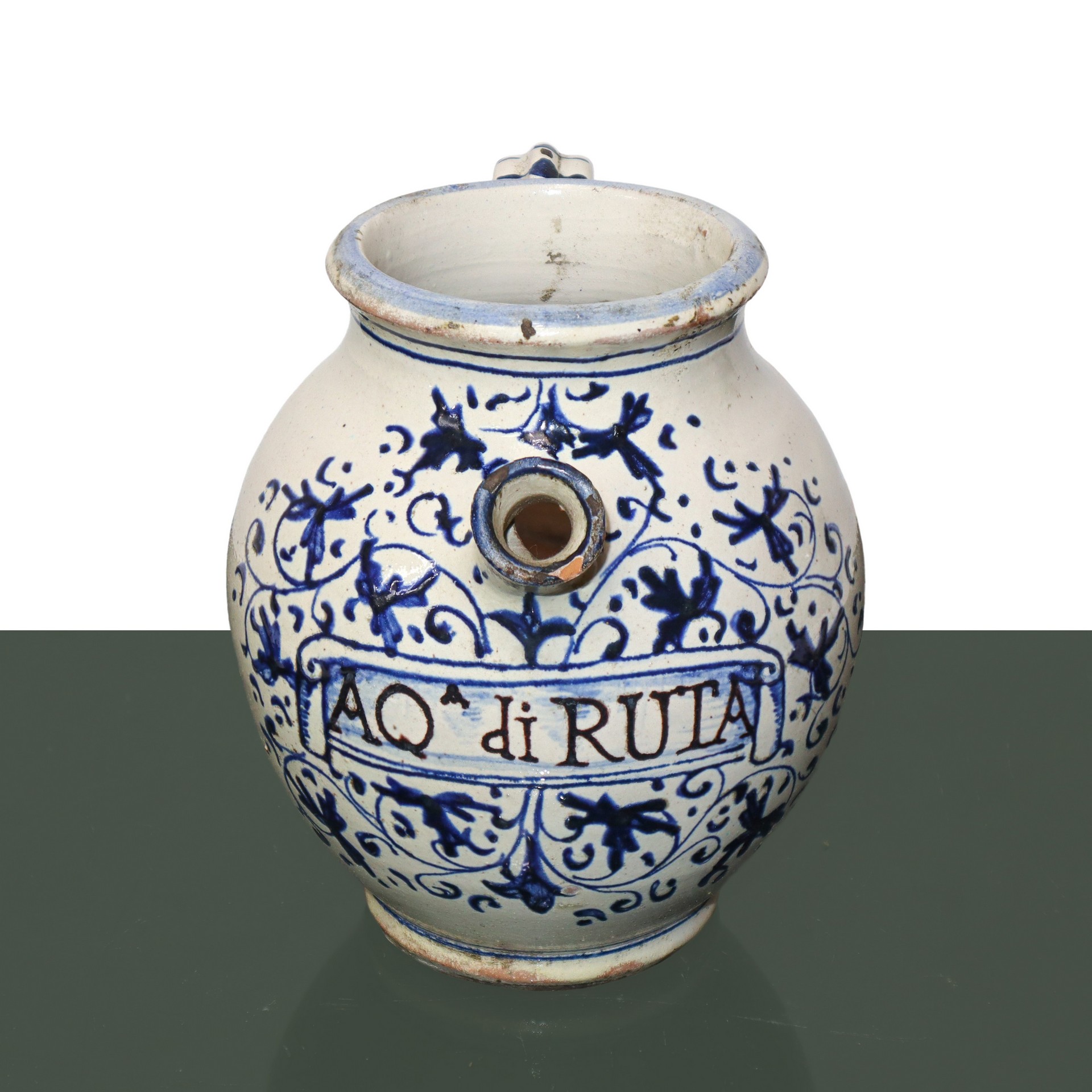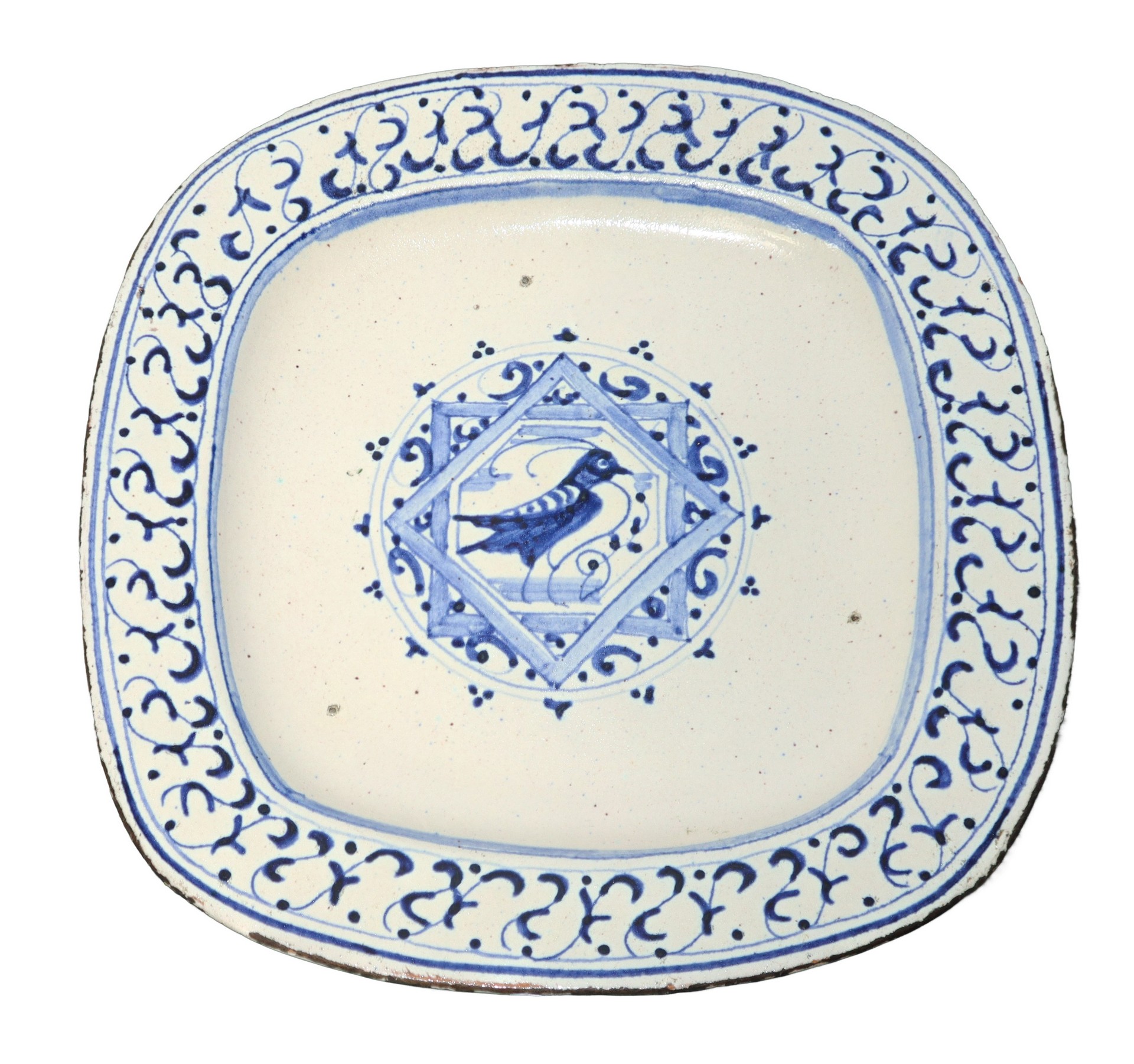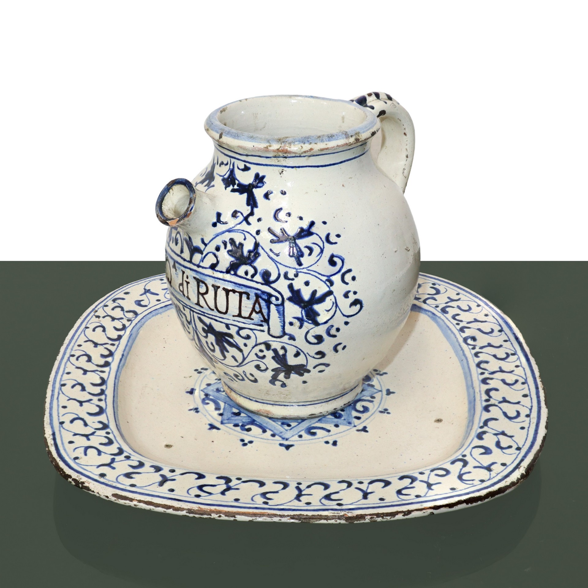 Deruta - Piatto e versatoio in maiolica Deruta decorati a motivi a foglie, primi 20° secolo versatoio h cm 17,5 piatto h cm 30X30 Sul fronte iscrizione AQ di RutaSul fronte iscrizione AQ di Ruta