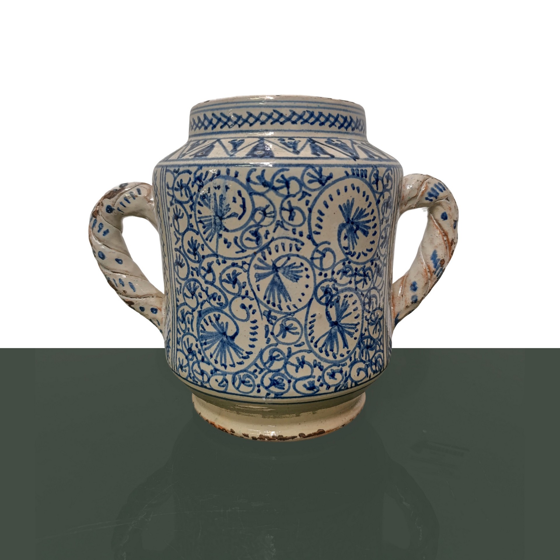 Vaso da farmacia in ceramica con decori blu su fondo bianco e volto di profilo, biansata