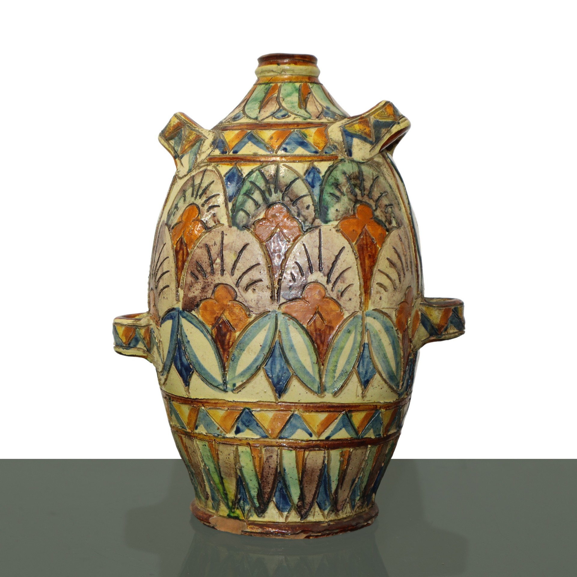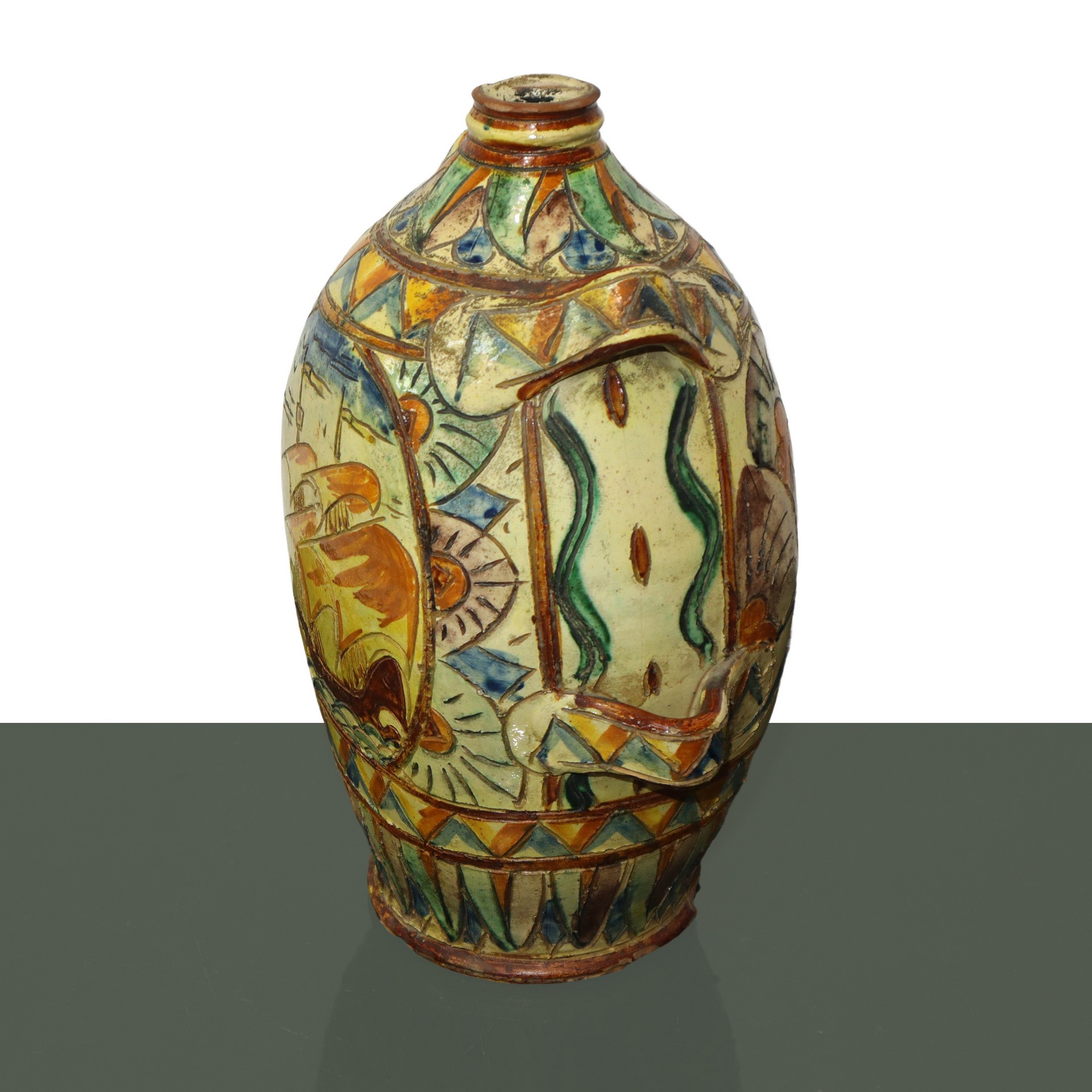 Anfora in ceramica policroma smaltata e decorata con veliero, Faenza primi 20° secolo