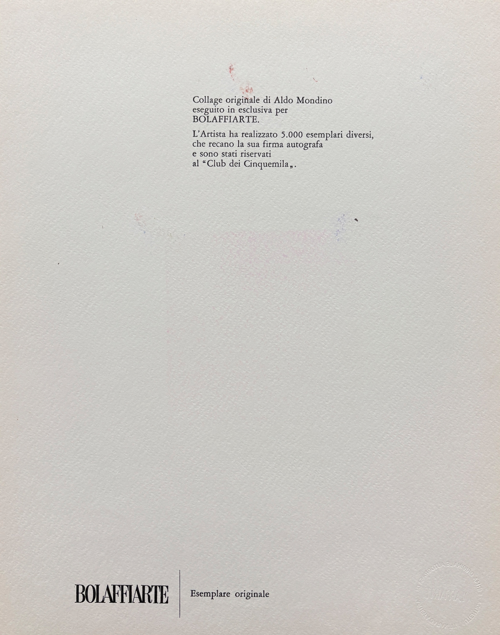Opera edita dall'Artista per Bolaffi Arte (Club dei Cinquemila) in 5000 esemplari diversi, ciascuno con firma autografa
