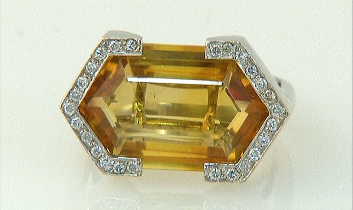 ANELLO. In oro bianco 18 kt con al centro quarzo citrino taglio fantasia, ai lati settori in diamanti taglio brillante per tot. cts. 0,20 ca.