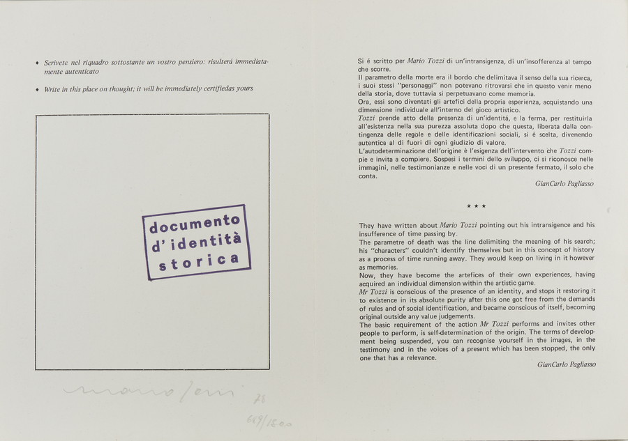 TOZZI MARIO (1895 - 1979) DOCUMENTO D'IDENTITA' STORICA. 1978. Stampa. Cm 15,00 x 21,00. firma, data e tiratura a matita, es. 689/1500