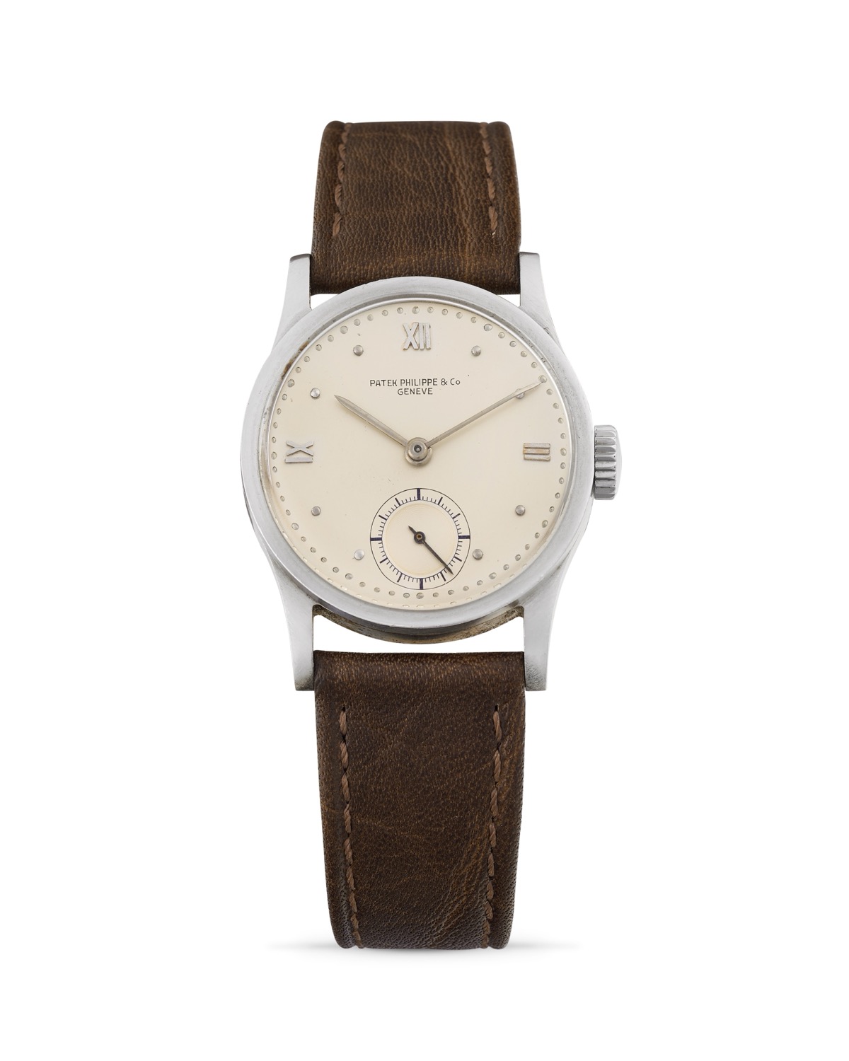 Cinturino in pelle e fibbia Patek Philippe in acciaio.
