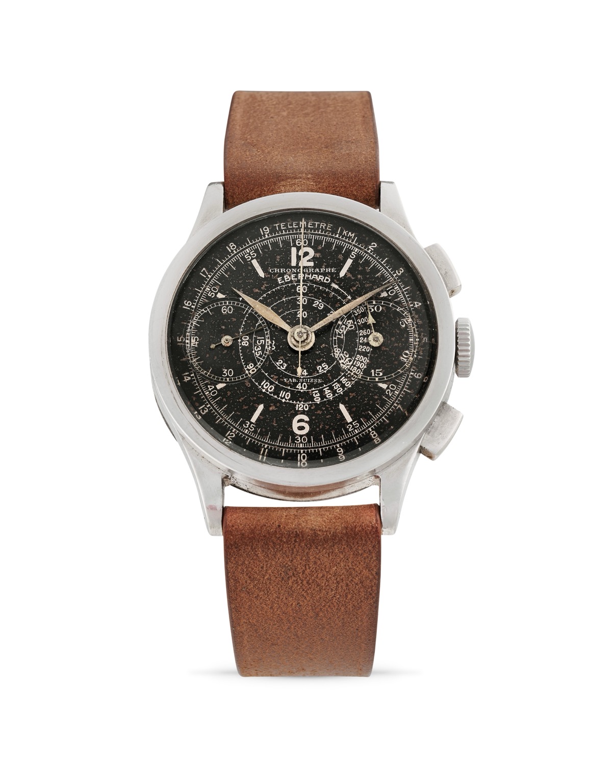 Quadrante nero virato al marrone, multiscala, indici e numeri arabi dipinti.