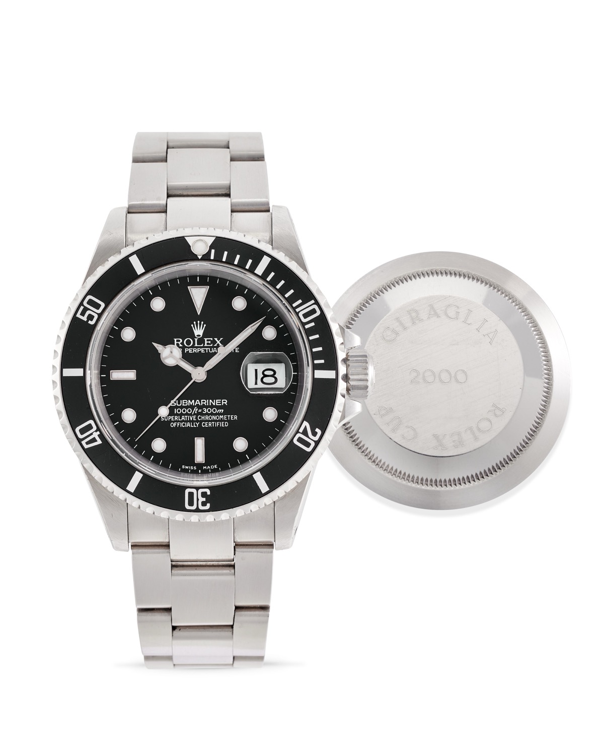 Cassa rotonda in acciaio, n.A868439, ghiera girevole in acciaio, lunetta nera in alluminio, fondello con incisione "Giraglia Rolex Cup 2000".