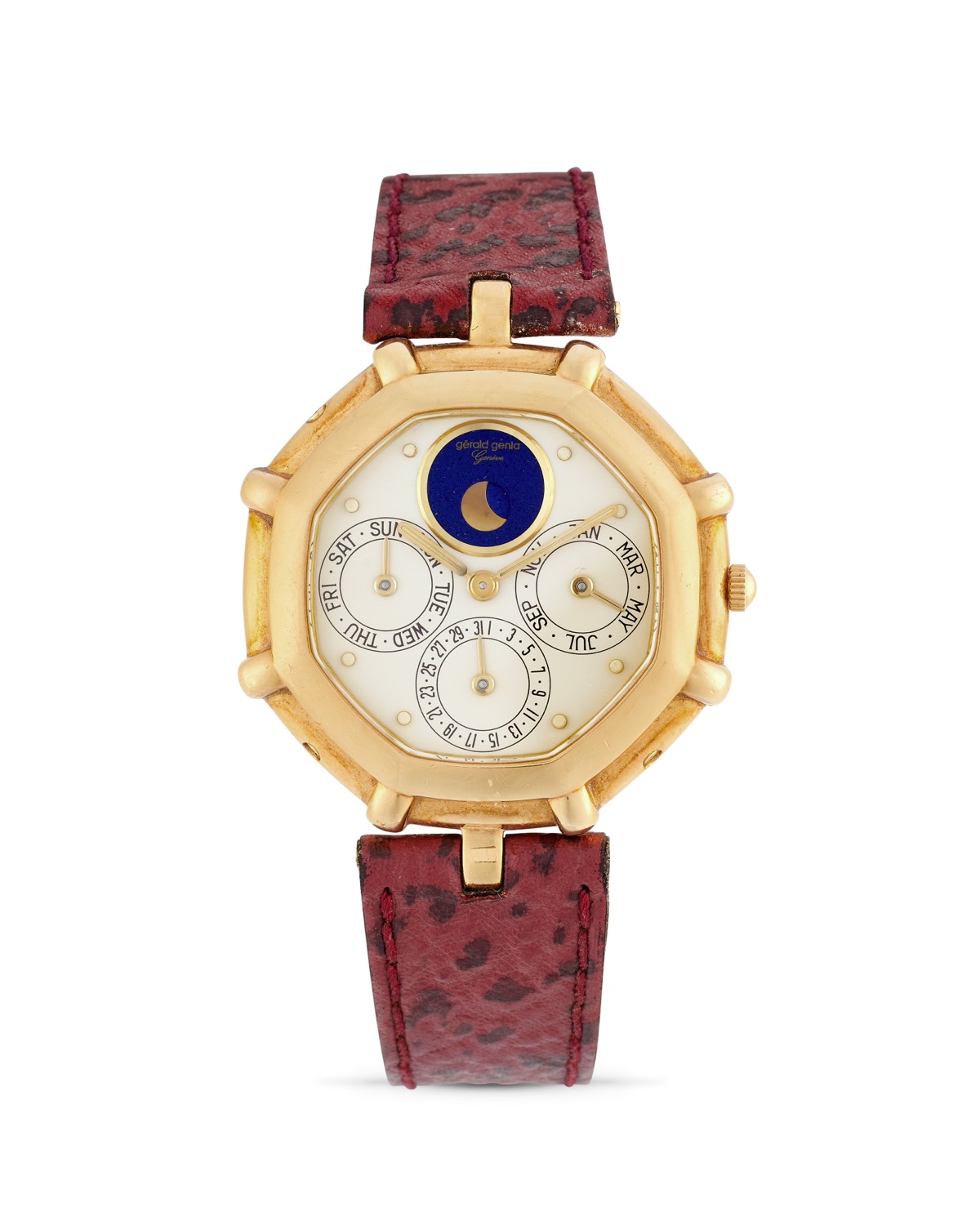 Cinturino in pelle e fibbia deployante Gérald Genta in oro bianco e giallo.
