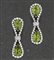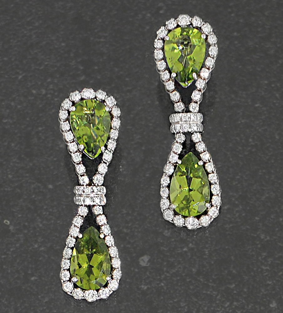 COPPIA DI ORECCHINI PENDENTI. In oro bianco 18 kt perno e clip con peridoti taglio goccia per tot. cts. 17,00 ca. entro decori in diamanti taglio brillante per tot. cts. 2,20 ca.