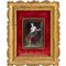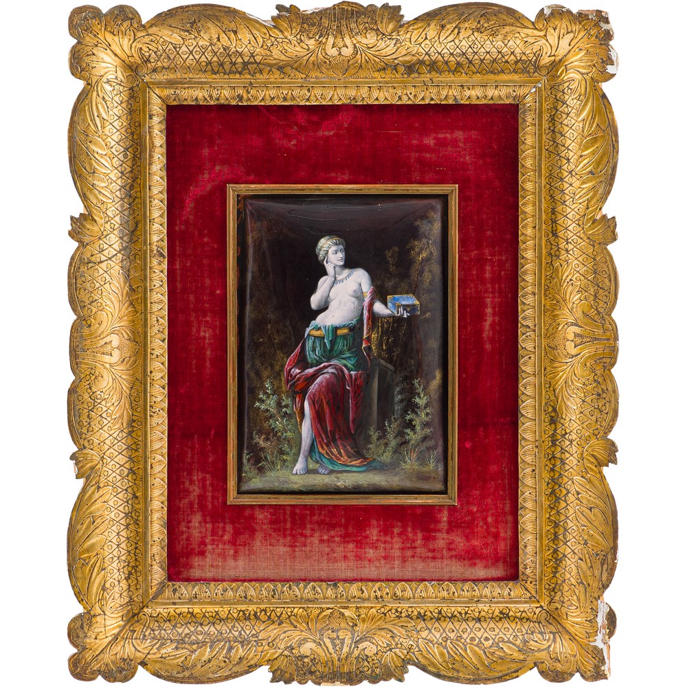 Placca smaltata su rame raffigurante "Ninfa con scatola in mano" entro cornice a vassoio in legno dorato ad argento e mistura.