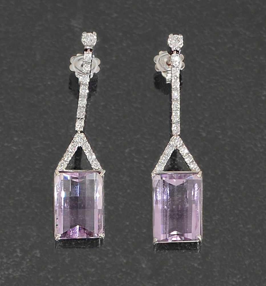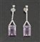 COPPIA DI ORECCHINI PENDENTI. In oro bianco 18 kt perno e farfalla, diamanti taglio brillante per tot. cts. 0,70 ca. con terminali in gemma viola taglio fantasia (prob. ametista).