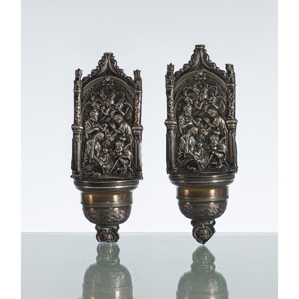 Coppia di acquasantiere in argento sbalzato raffiguranti "Natività". Recano punzone Stato Romano sotto la dominazione Francese (1809-1815) (g. 98,00) (usure).
