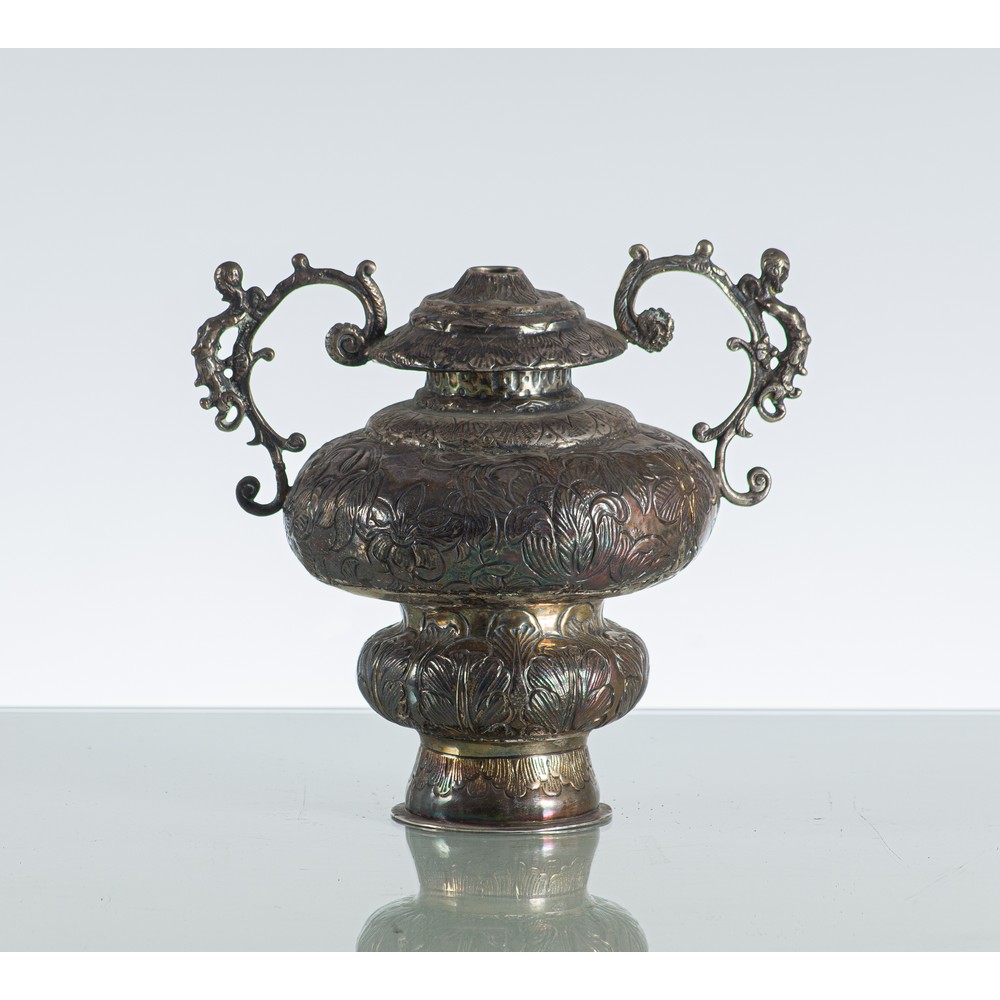 Portapalme biansato in argento sbalzato a motivo floreale e fogliaceo. Reca punzoni consoli Vincenzo De Florio e Francesco Arbizola.