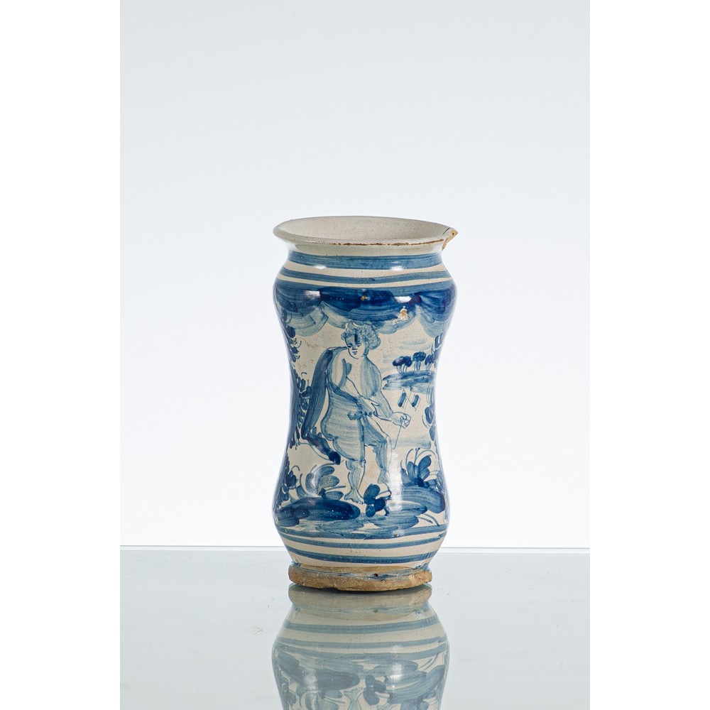 Albarello in ceramica smaltata e decorata nei toni del bianco e blu "Paesaggio con figura mitologica" (usure e mancanze).