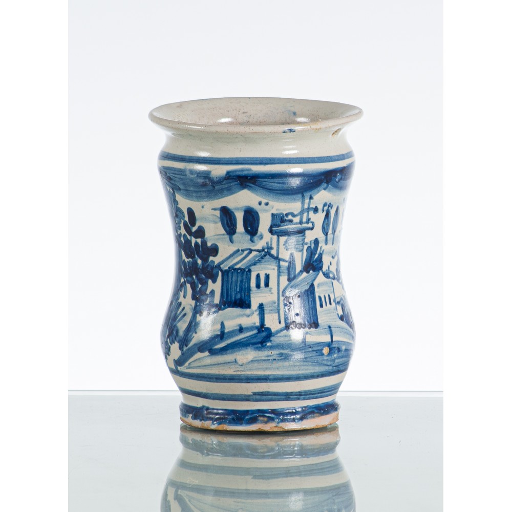 Rocchetto in ceramica smaltata e decorata raffigurante "Paesaggio con caseggiato" (usure e difetti).