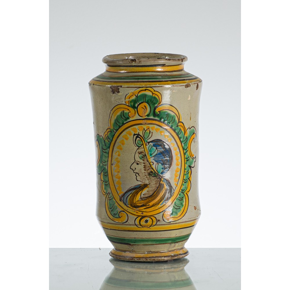 Cilindro in ceramica smaltata e decorata con medaglione raffigurante "Profilo di figura femminile" (filè, mancanze e usure).