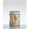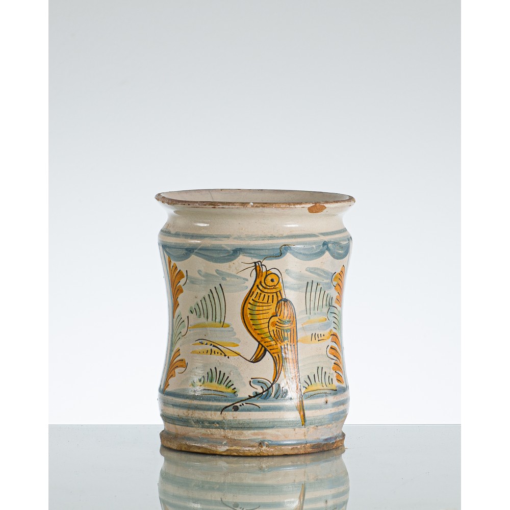 Cilindro in maiolica policroma con decori raffigurante "Volatile".