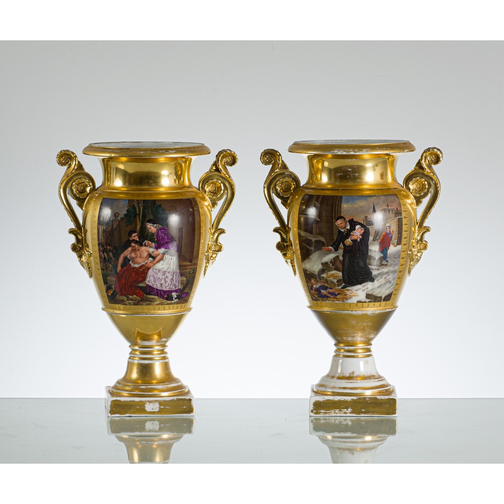 Coppia di vasi Impero in porcellana dipinta a mano, medaglioni raffiguranti "Scene di carità", doratura ad oro zecchino.