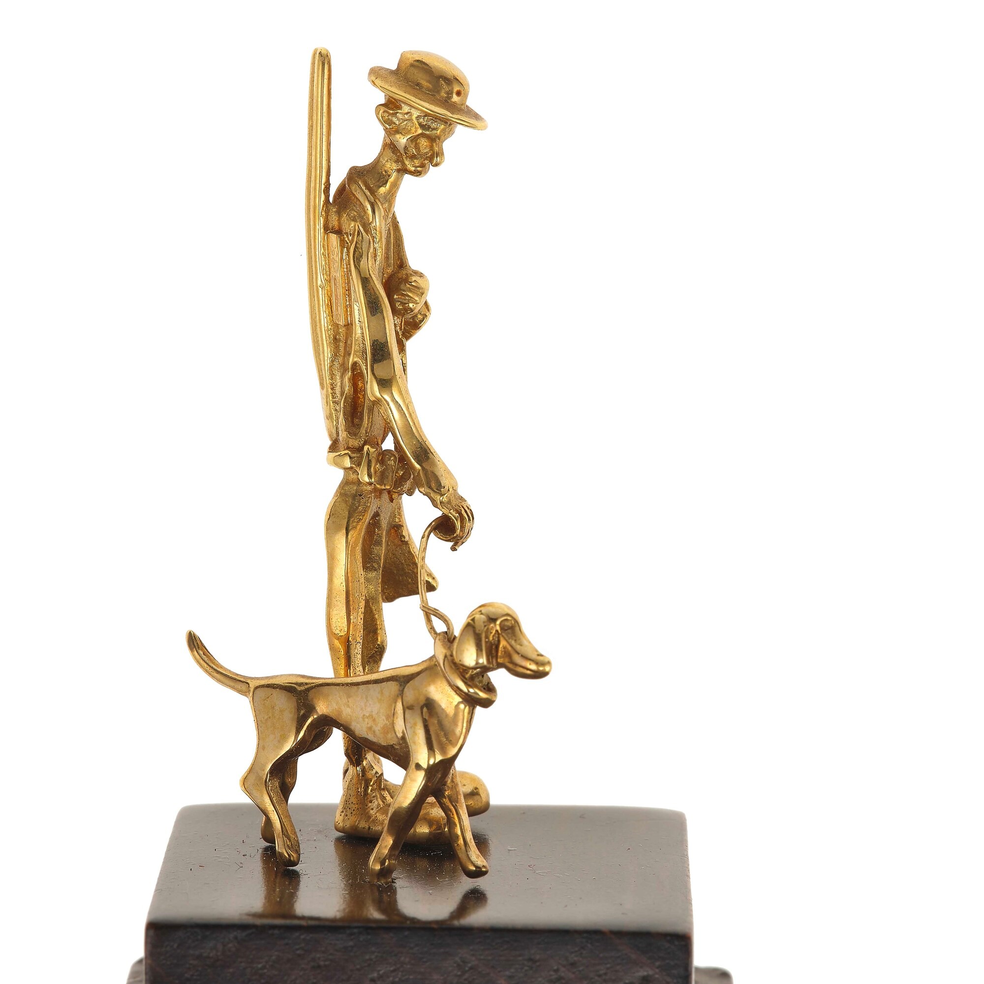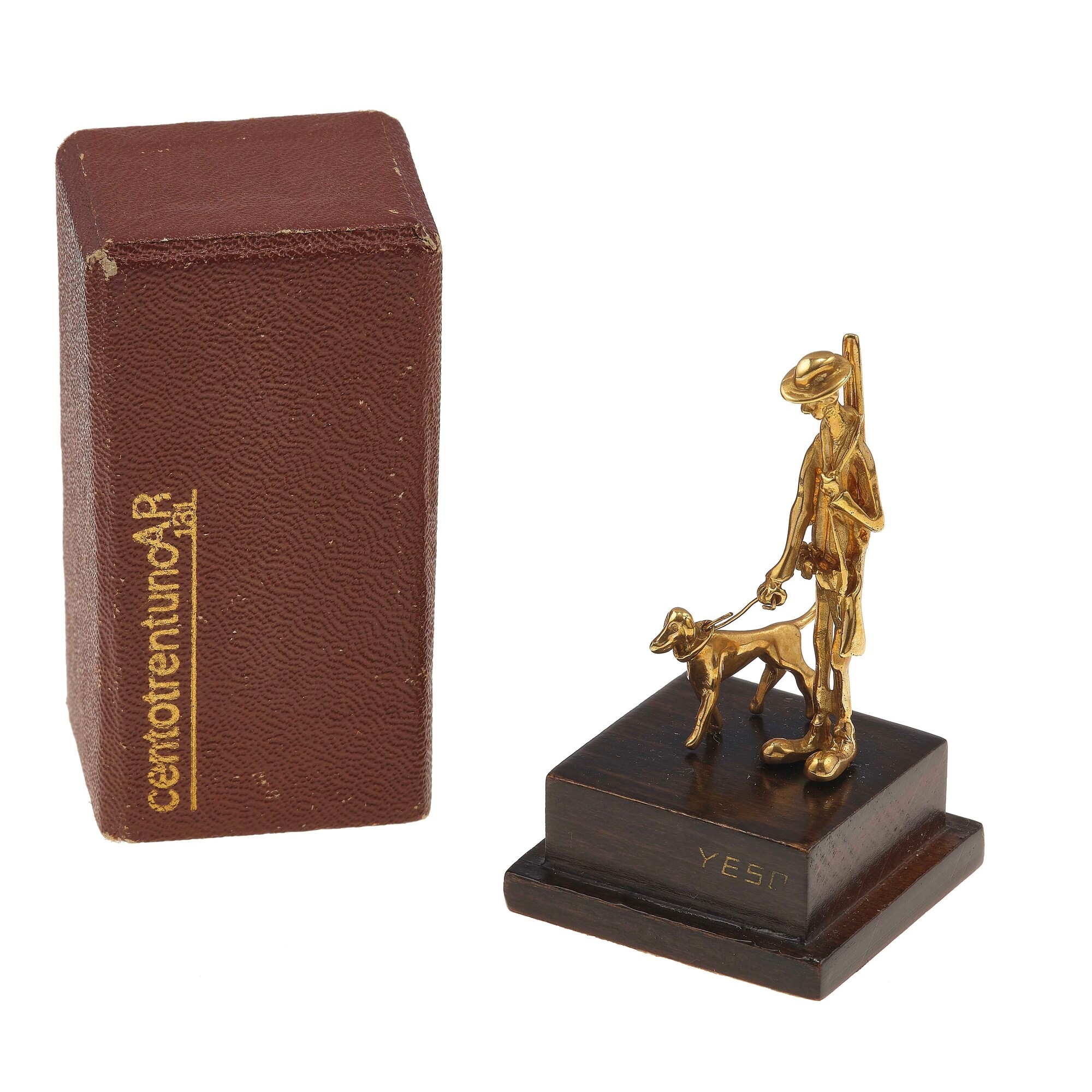 Piccola scultura 'cacciatore con cane' oro giallo 750/1000, base in legno,...