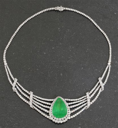 COLLANA. In oro bianco 18 kt a maglie incernierate con interruttori verticali sul fronte percorse interamente da diamanti taglio brillante per tot. cts. 28,60, al centro grande smeraldo Colombia taglio goccia di cts. 44,98, con allegato certificato gemmologico n.357054 Centro Analisi Gemmologiche Dott. Pio Visconti Valenza.