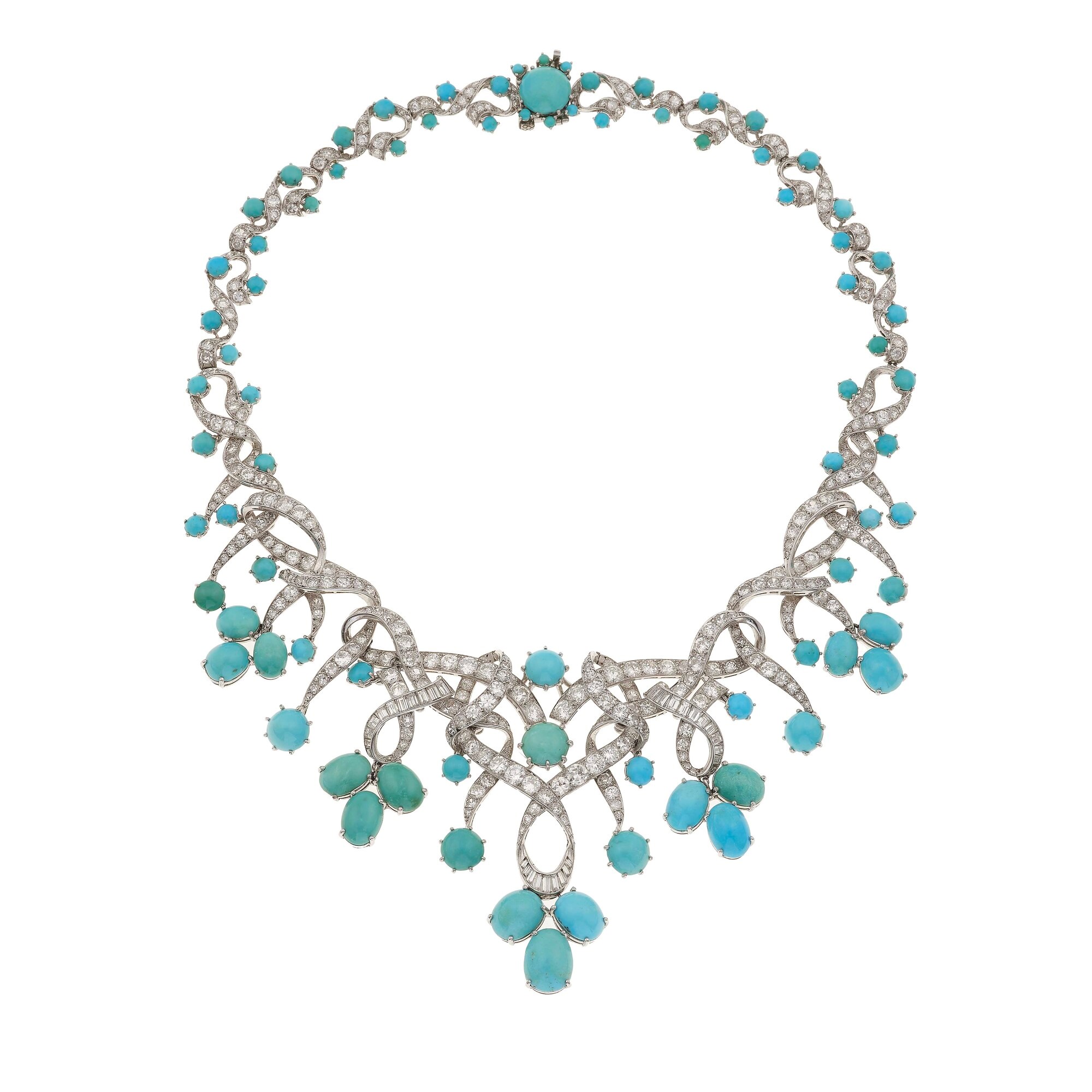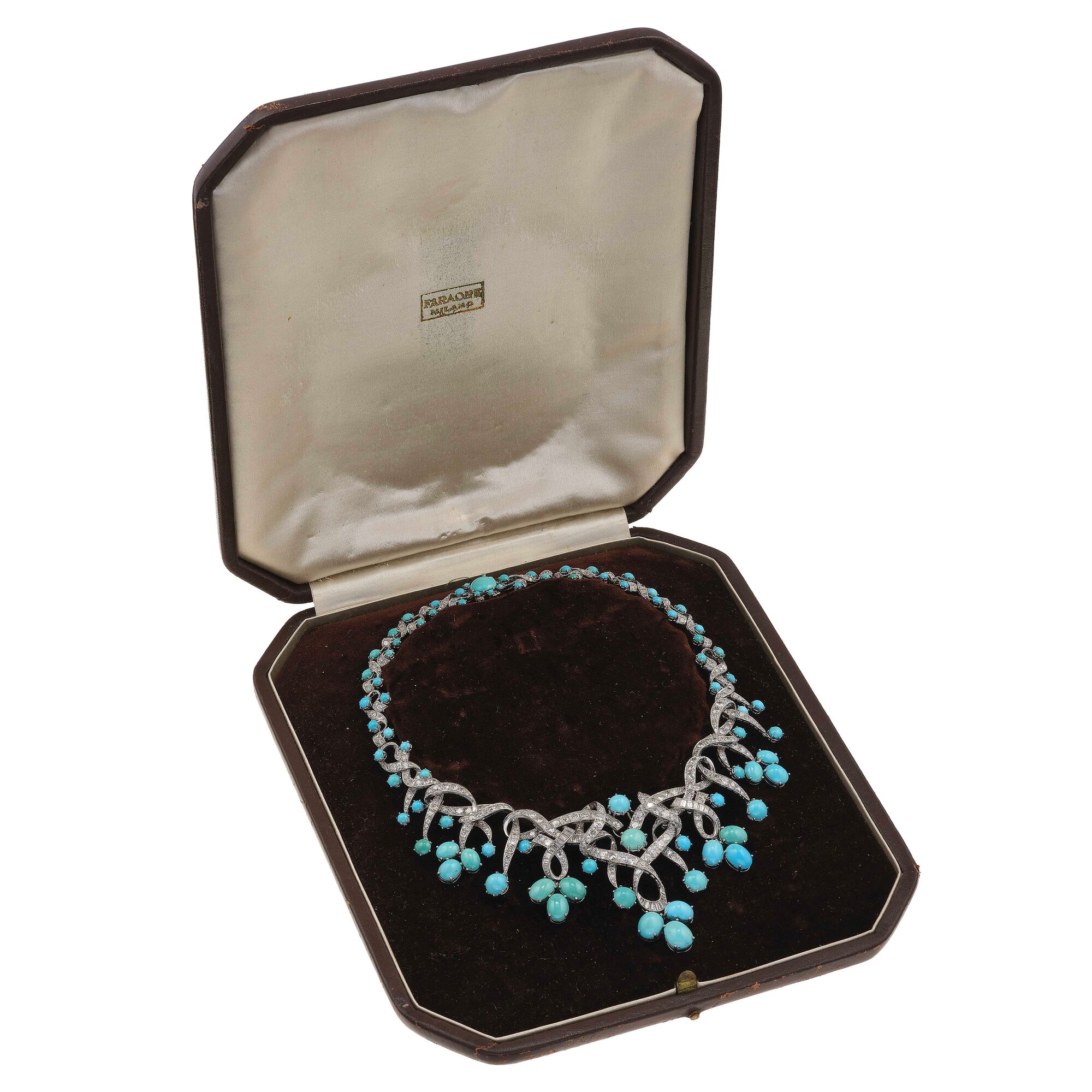 Monture Faraone. Girocollo con diamanti e turchesi montatura in oro bianco...