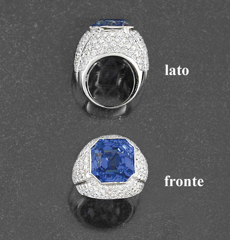 ANELLO. In oro bianco 18 kt internamente foderato realizzato a cupola con al centro zaffiro taglio ottagonale gradinato di cts. 34,28 (nessuna indicazione di trattamento termico) entro contorno in diamanti taglio brillante disposti a pavè per tot. cts. 8,00 ca., lo zaffiro è accompagnato da Certificato gemmologico n. 14070041 del 16/07/2014 Dr. Stefanos Karampelas Gubelin Gemlab.