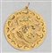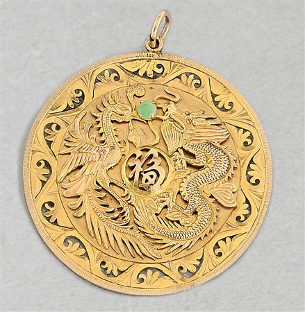 CIONDOLO. In oro giallo 14 kt di forma circolare, gemma verde taglio cabochon (prob. giada), lamine sovrapposte, traforate ed incise.
