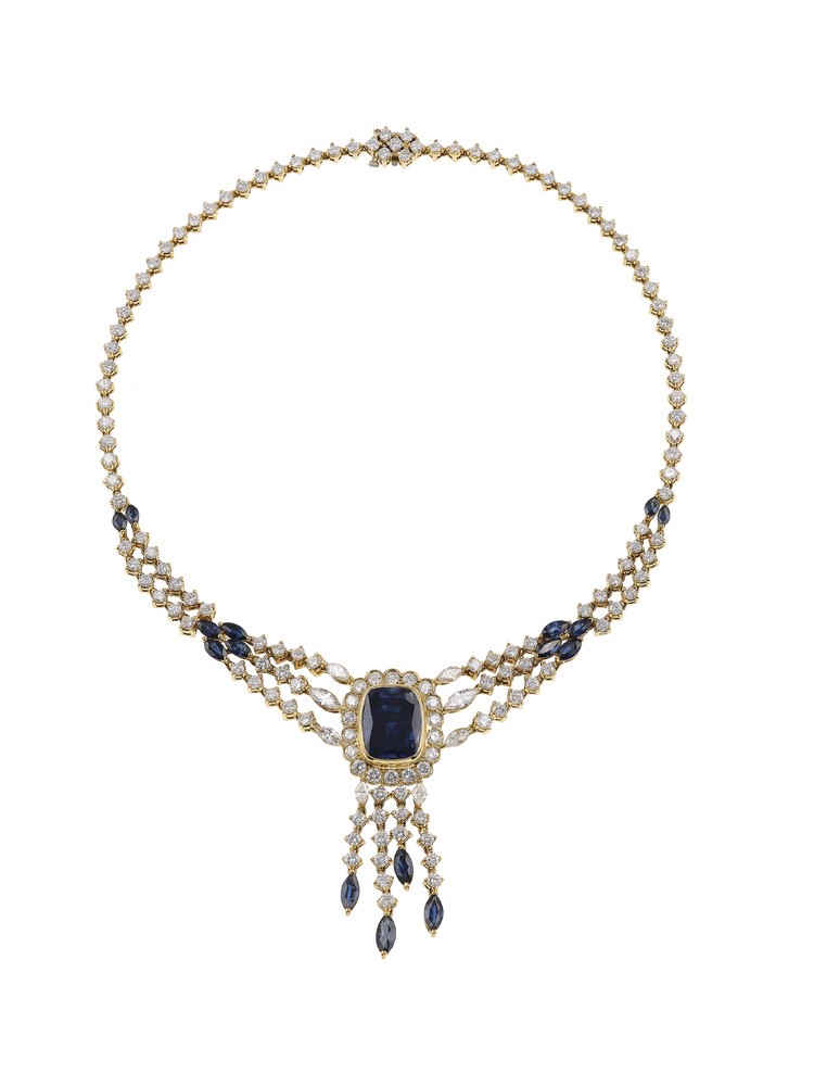 Damiani. Girocollo con diamanti taglio brillante e navette per ct 14.30 circa e zaffiri per ct 21.70 circa