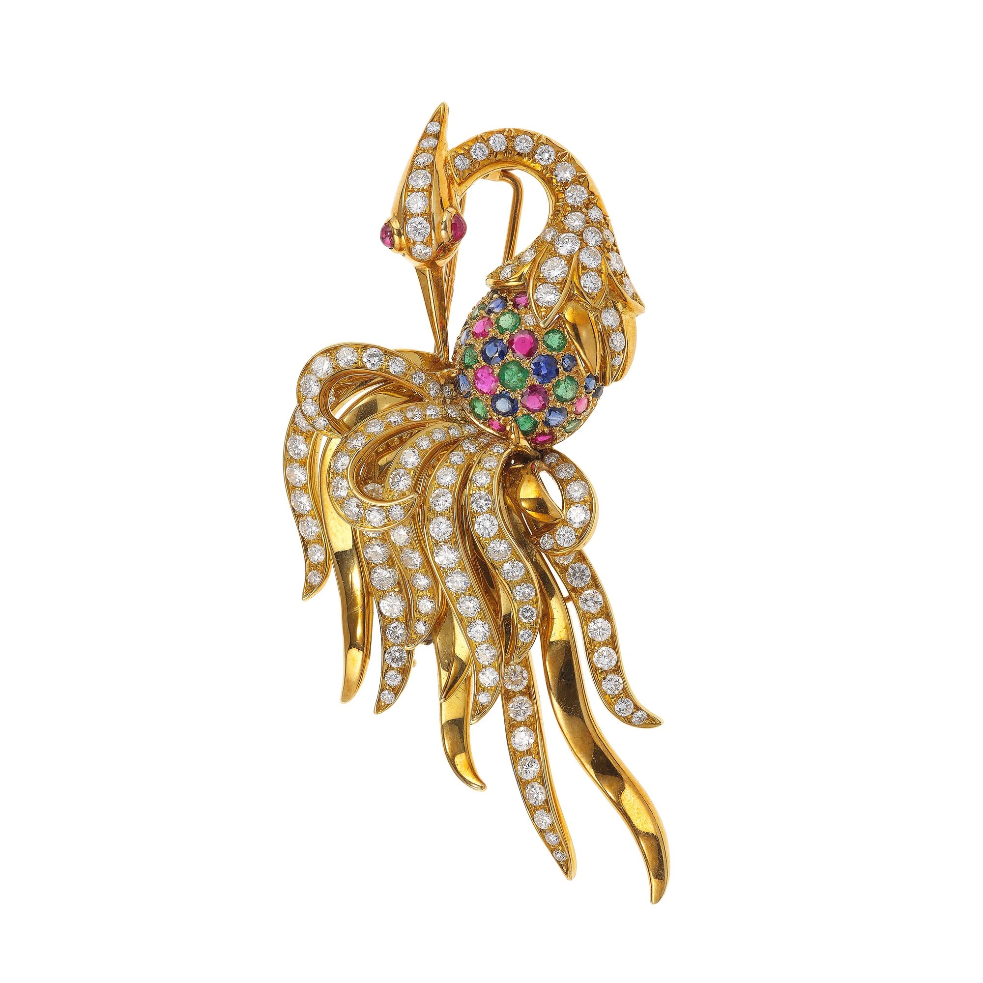 Spilla “fenice” con diamanti, rubini, smeraldi e zaffiri