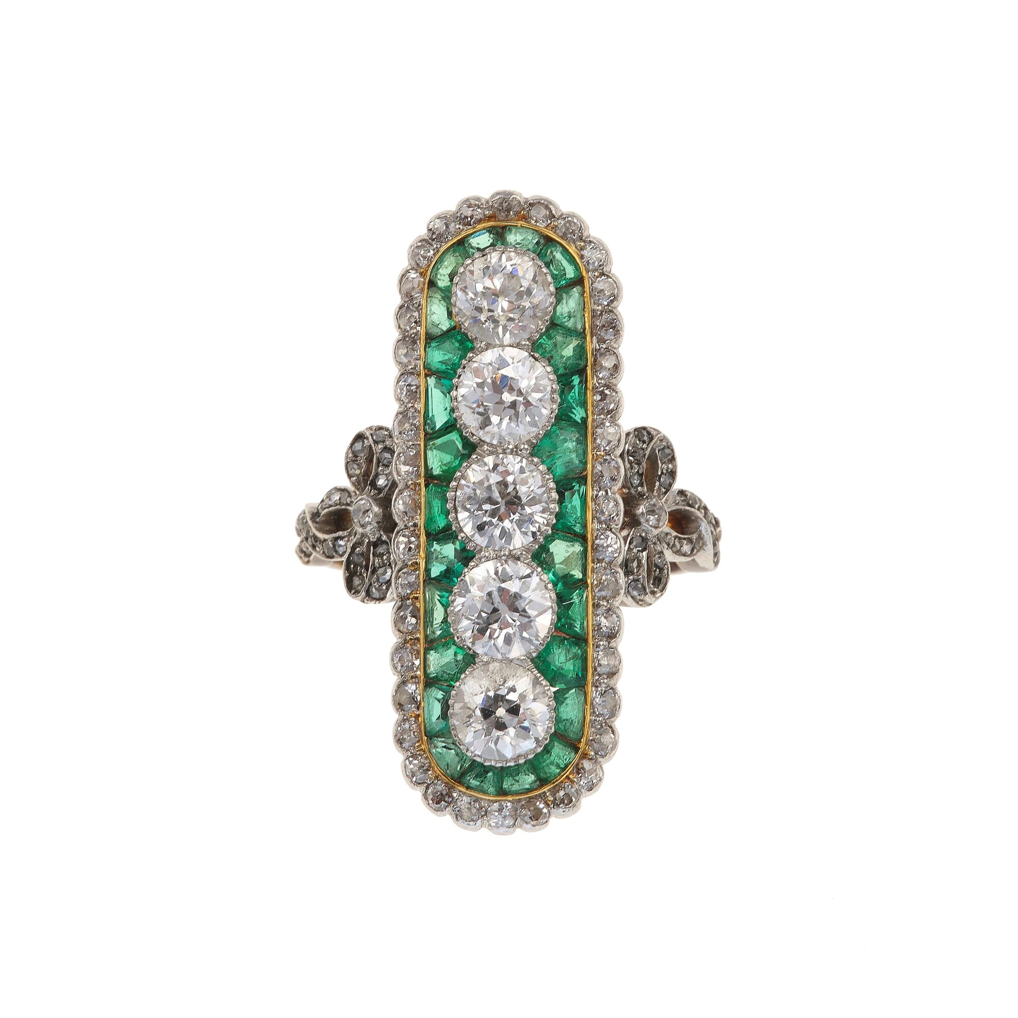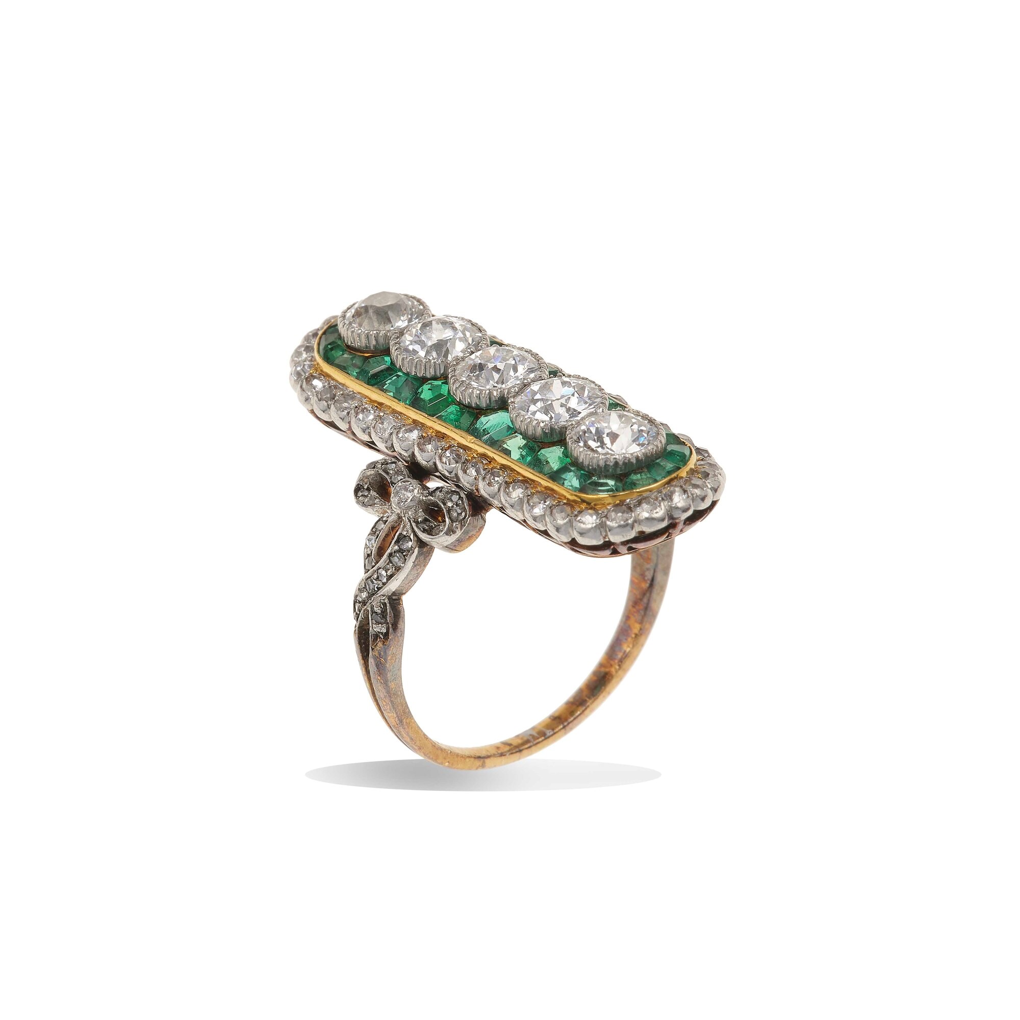 Anello con diamanti e smeraldi montatura in oro giallo 750/1000 ed argento,...