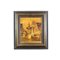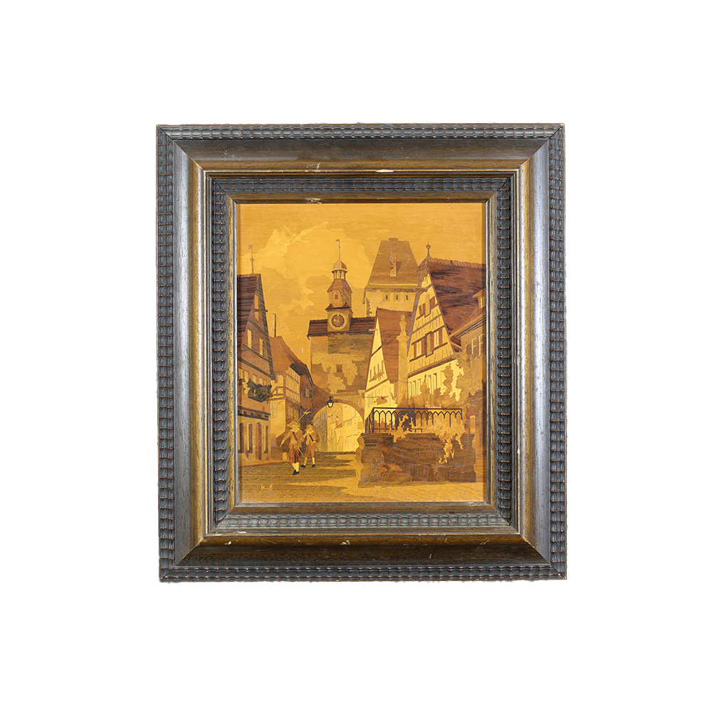 PANNELLO intarsiato in varie essenze di legno raffigurante scorcio cittadino con personaggi XX secolo h cm 32 x 27 / cornice h cm 46,5 x 51,5