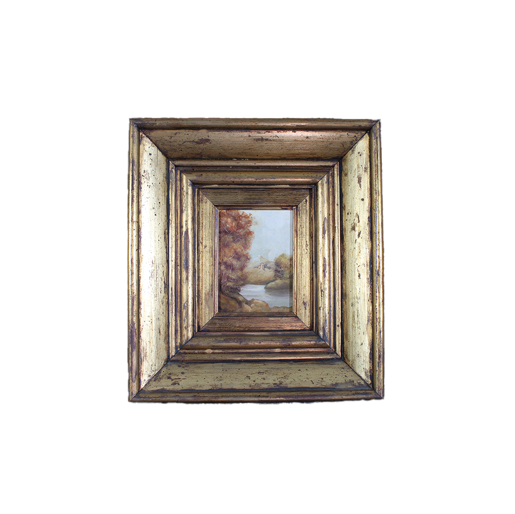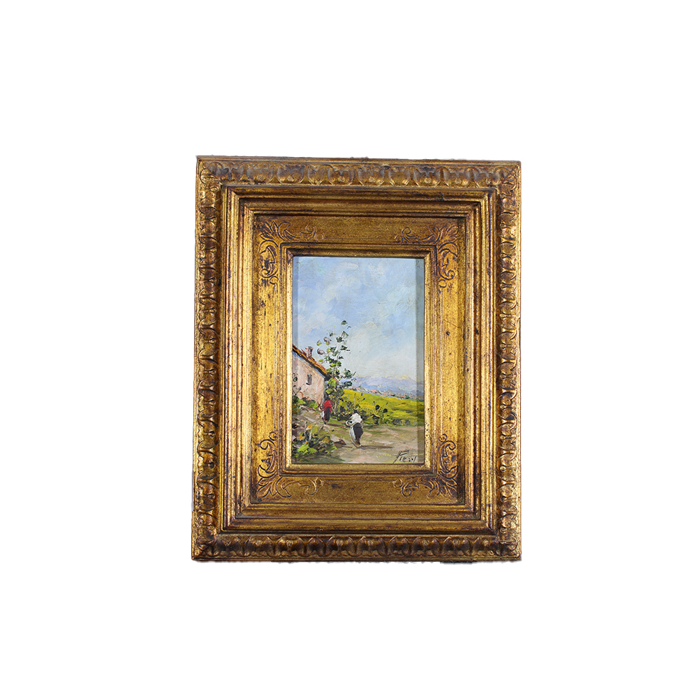 TRE QUADRETTI DIPINTI AD OLIO SU FAESITE raffiguranti paesaggi dentro cornice in legno dorato. Firme indistinte XIX / XX secolo misure varie