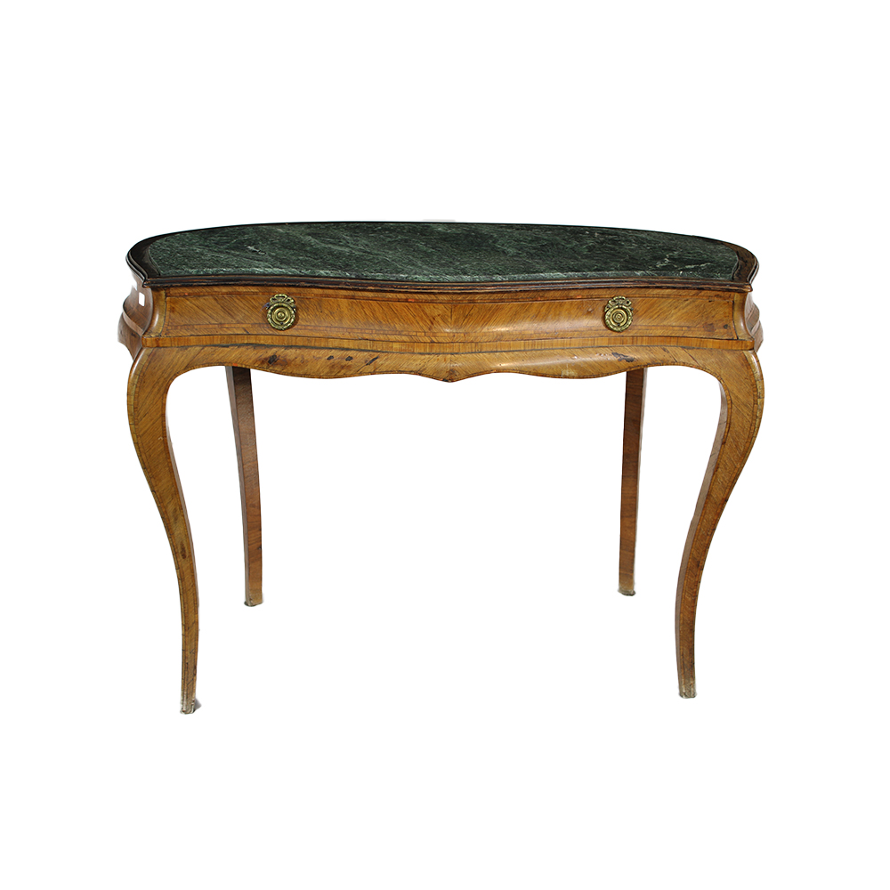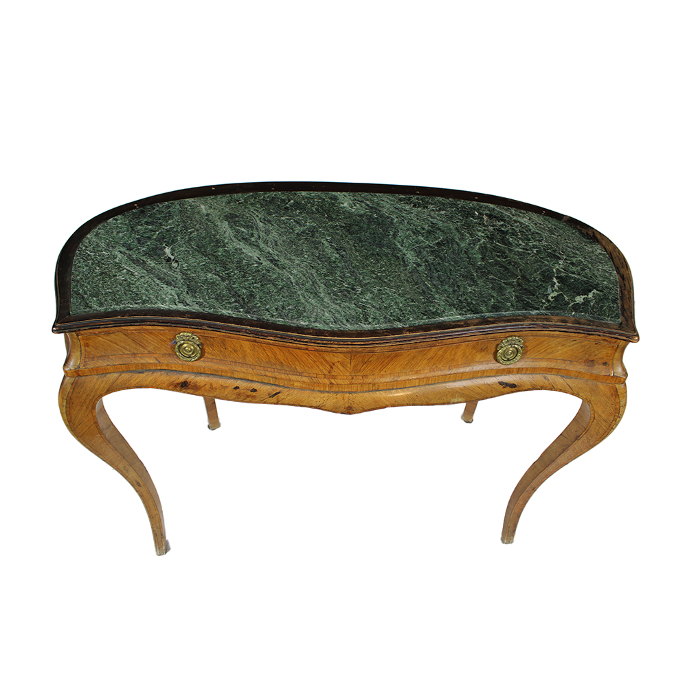 TOLETTA DI GUSTO LUIGI XV lastronata in legno di palissandro e bois de rose con piano in marmo verde delle Alpi maestranze siciliane primi 900 h cm 74 x 107 x 51