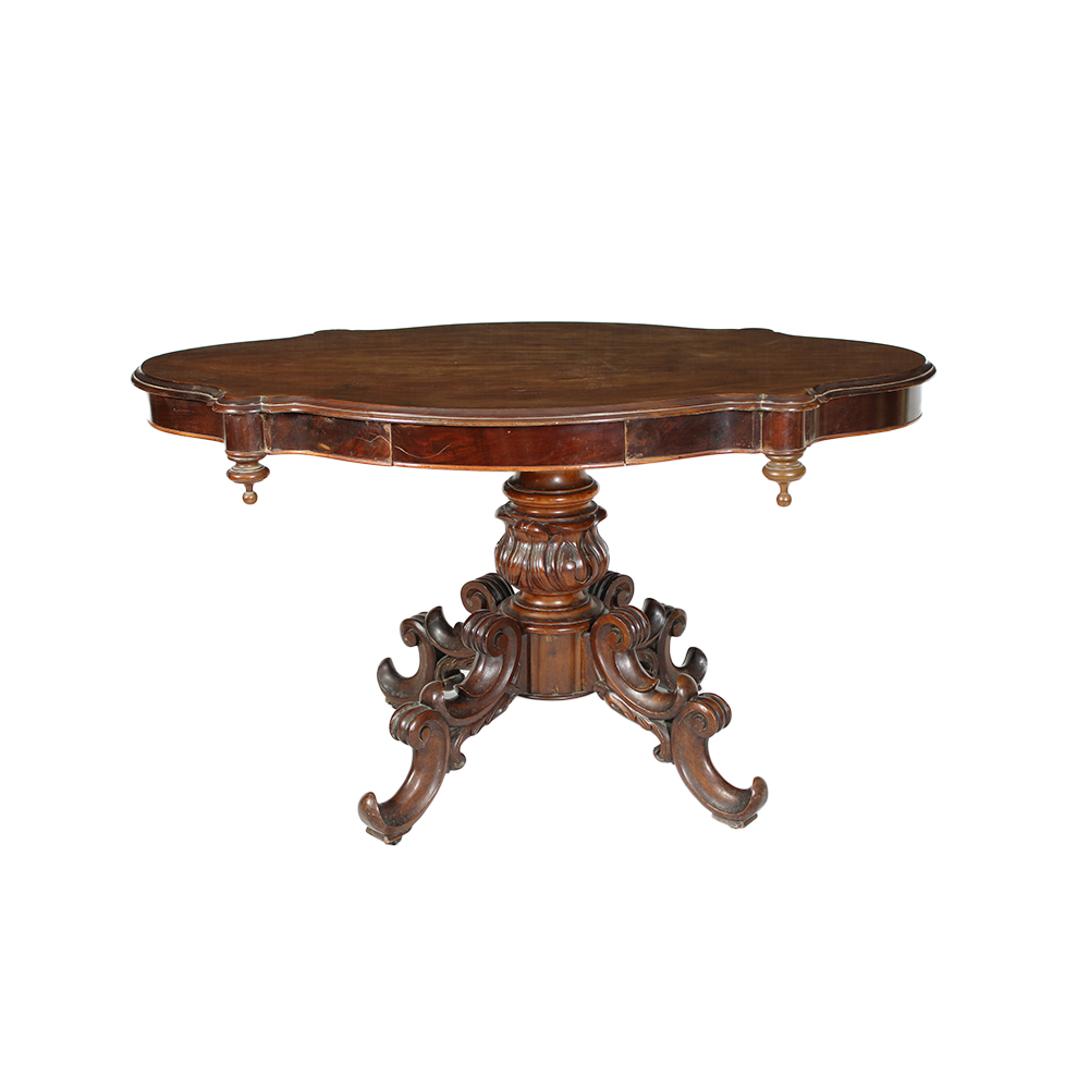 TAVOLINO A BISCOTTO in piuma di mogano, piede centrale e due cassetti Francia XIX secolo h cm 72 x 128 x 83