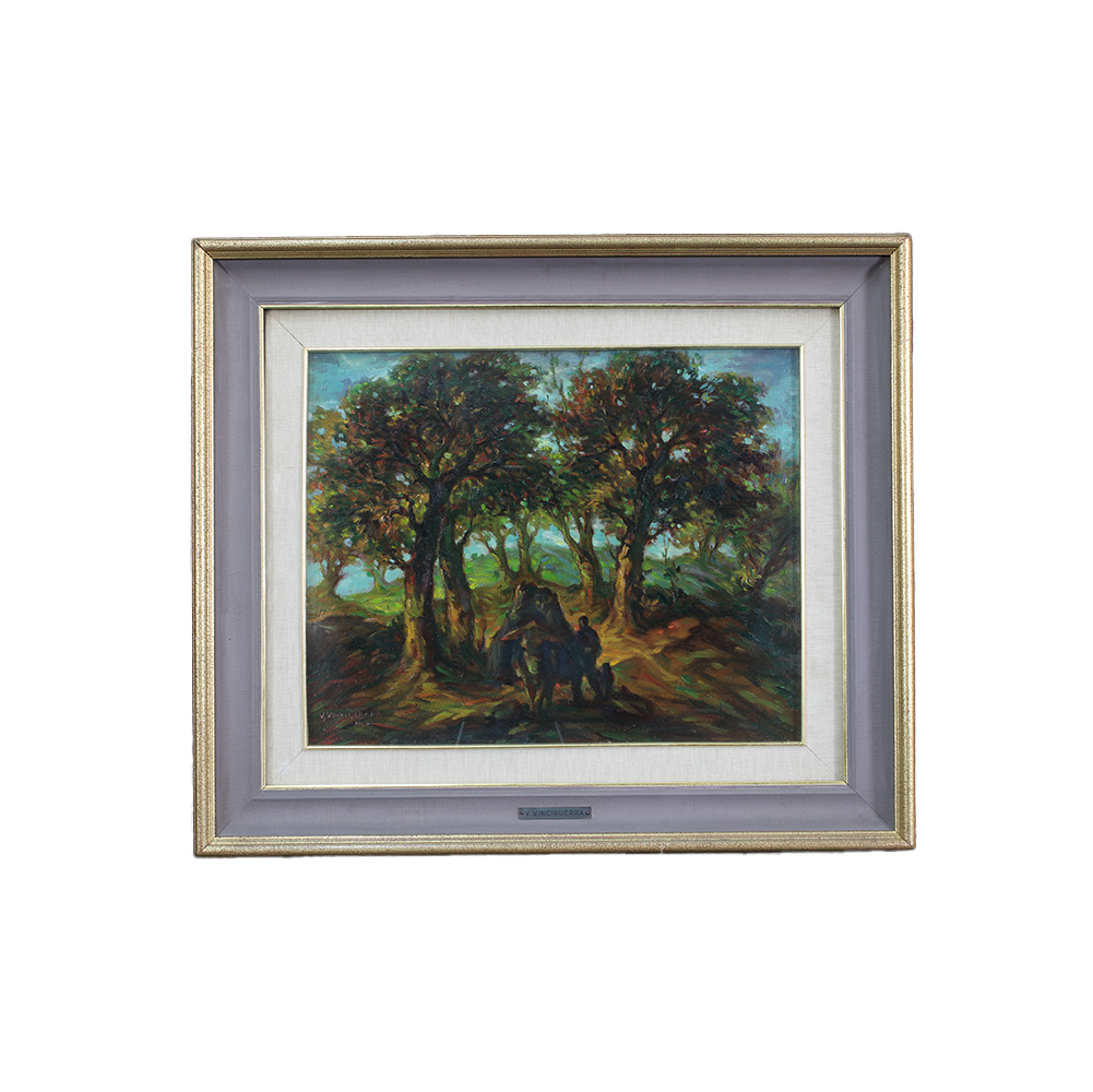 OLIO SU COMPENSATO raffigurante paesaggio boschivo Il legnaiolo dentro cornice in legno dorato, firma in basso a sx, reca foglietto indicante autore e prezzo sul retro. V. Vinciguerra 1961 h cm 40 x 50 - cornice h cm 60,5 x 71,5
