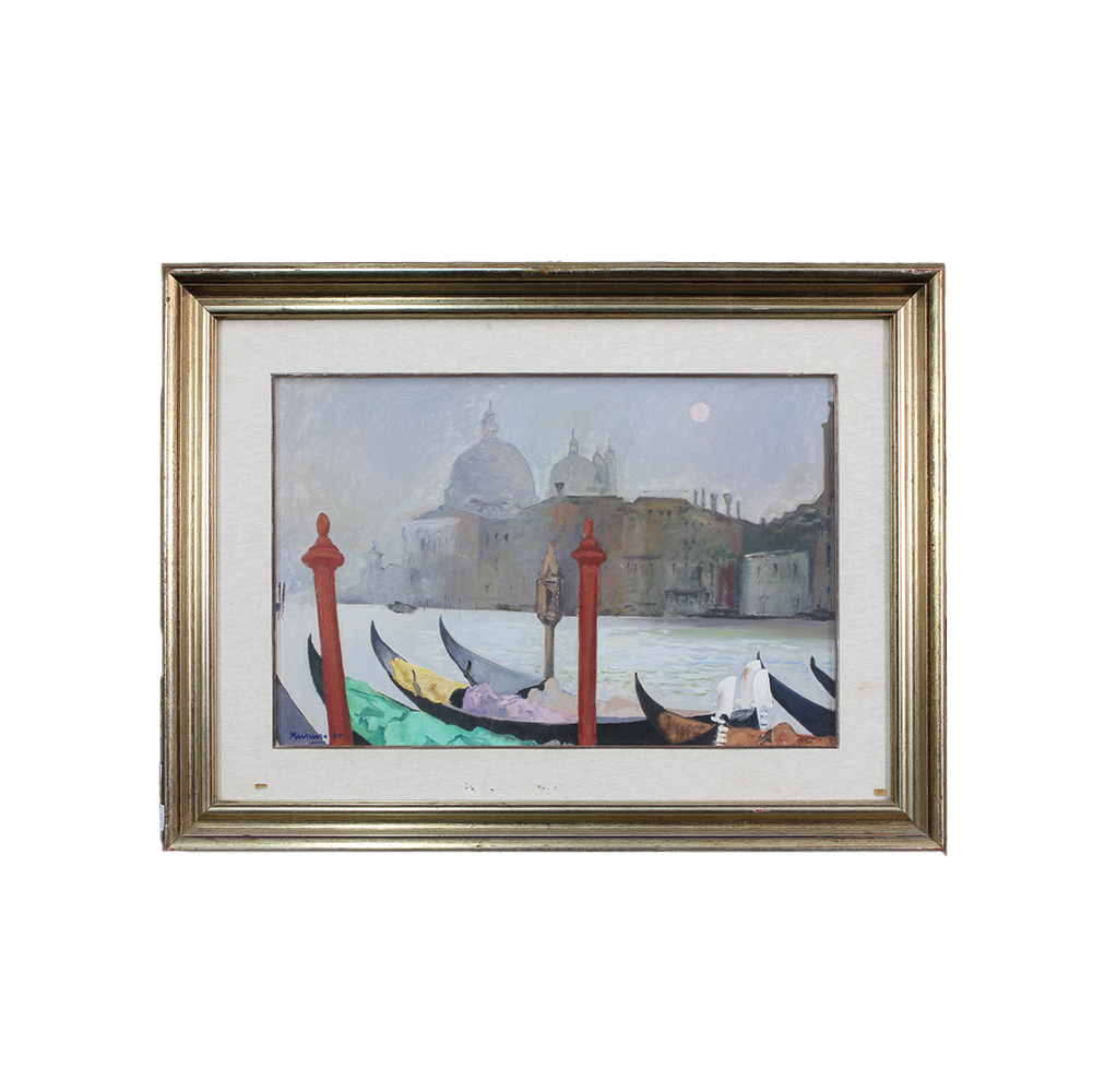 OLIO SU TELA raffigurante paesaggio veneziano Nebbia sul Canal grande reca firma in basso a sx Muscuso 80 (Catania 1910-2003) XX secolo h cm 40 x 58 - cornice h cm 62,5 x 82,5