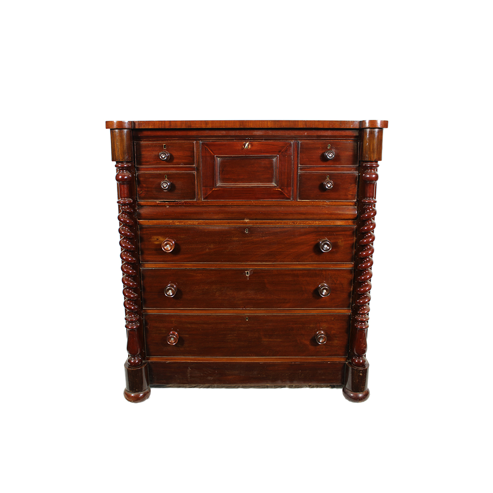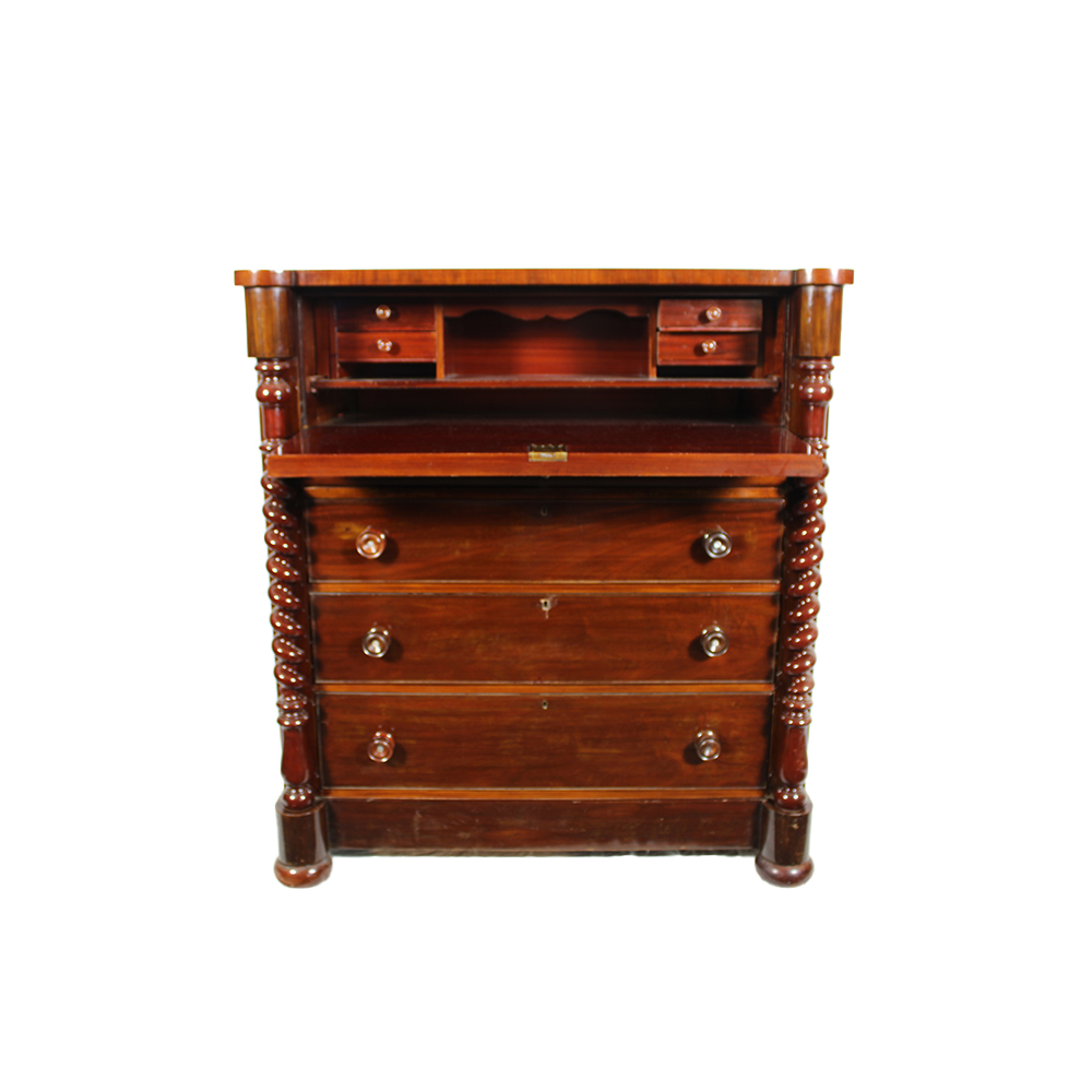 CASSETTONE in piuma di mogano a 3 cassetti nella parte inferiore e anta a ribalta, nella parte superiore centrale scarabattolo Napoli XIX secolo h cm 132 x 120 x 58