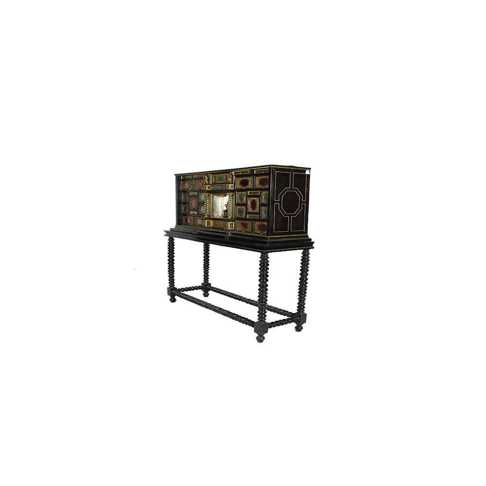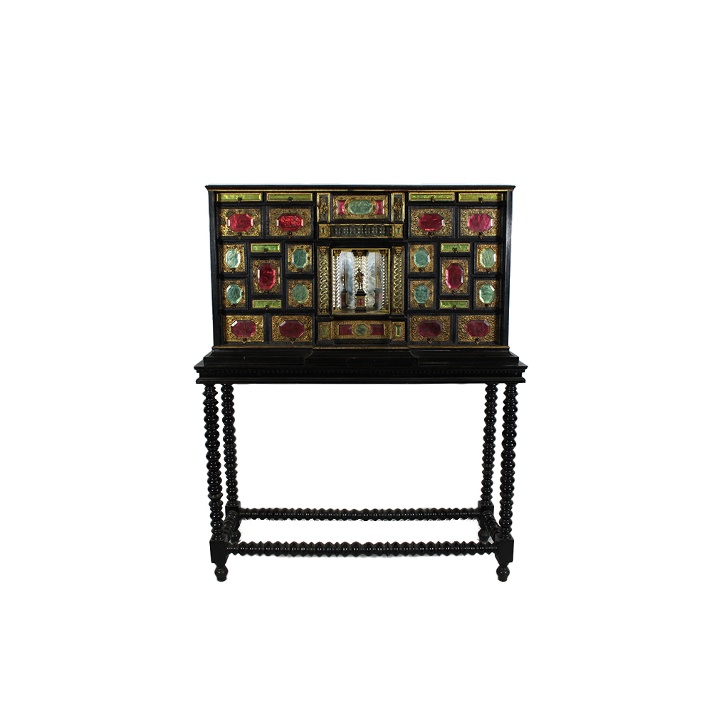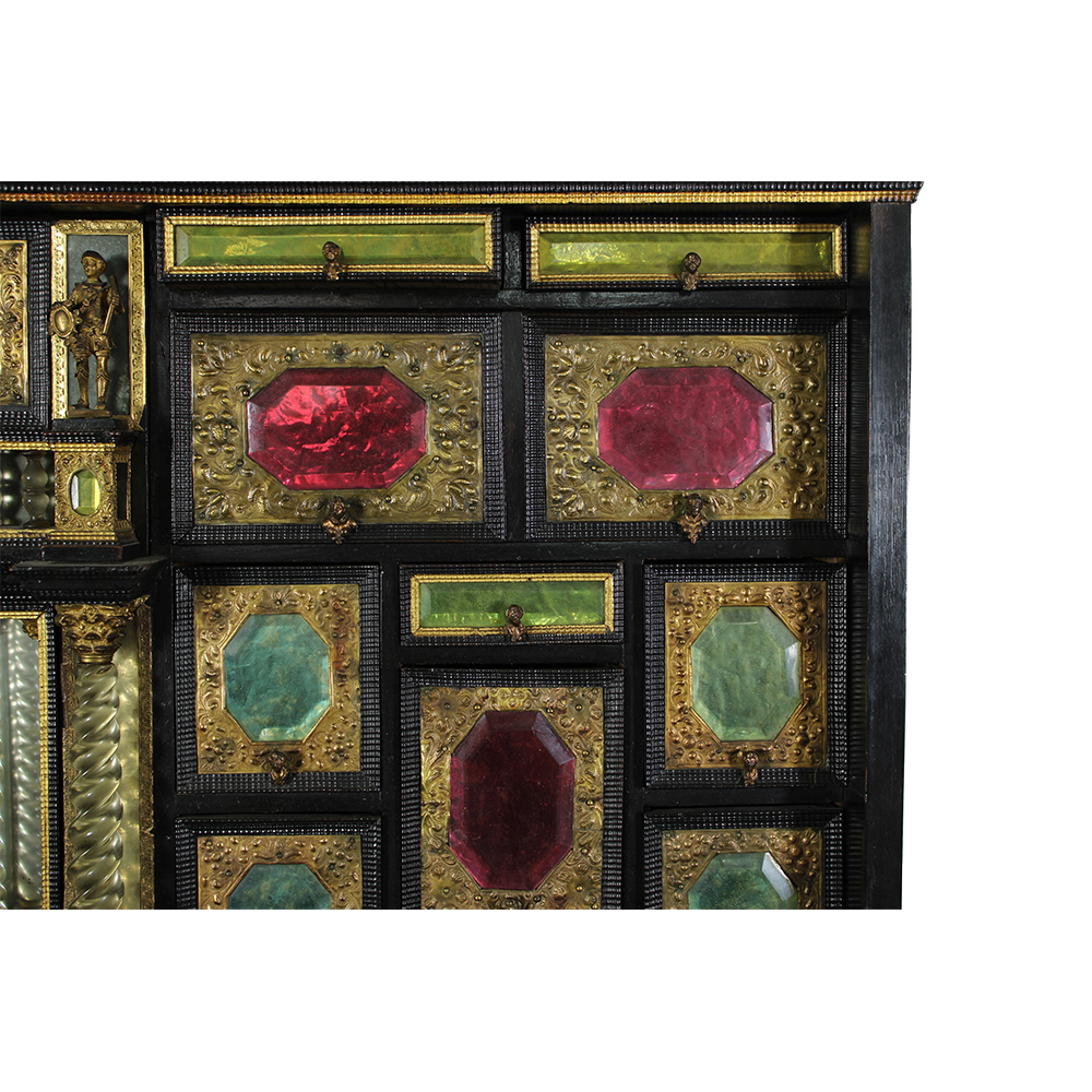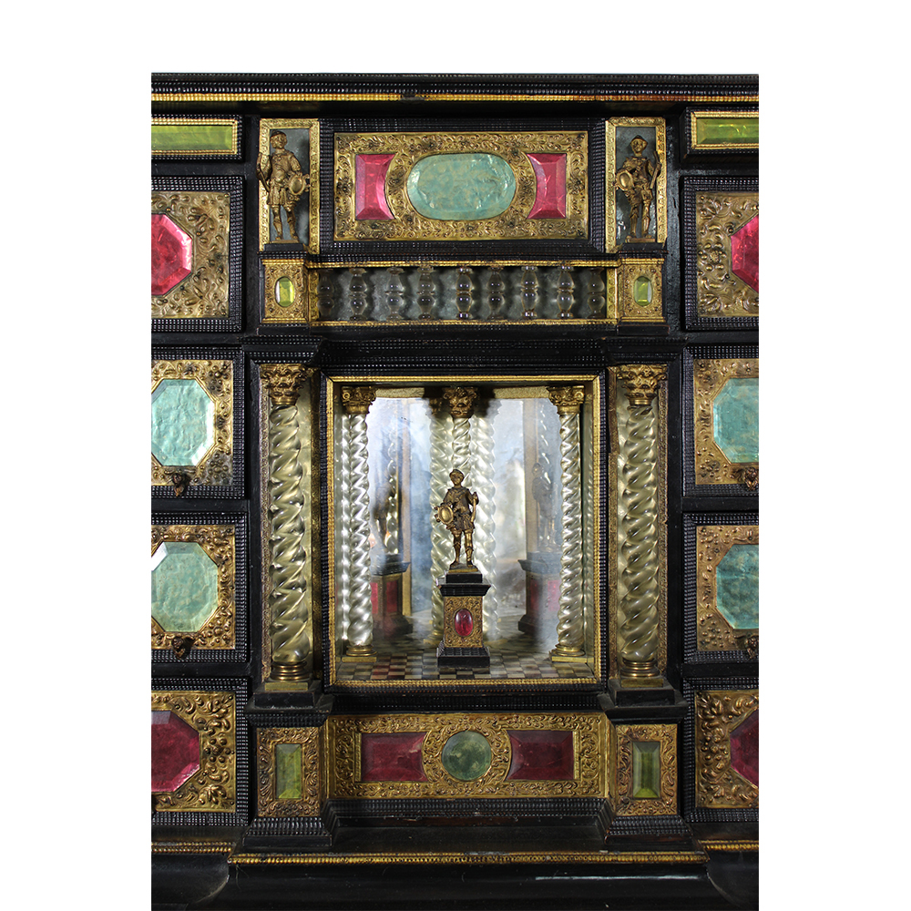 IMPORTANTE MONETIERE in legno ebanizzato con cassetti arricchiti da placche finemente sbalzate e cesellate, parte centrale a tempietto con colonne a salamoia in vetro e scultura in bronzo dorato, base a consolle con colonne tornite maestranze siciliane XVIII secolo h cm 156 x 124 x 41
