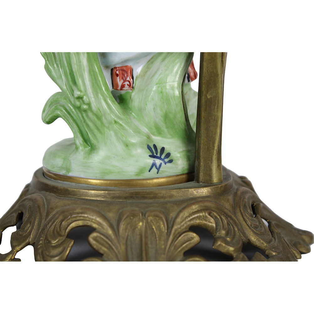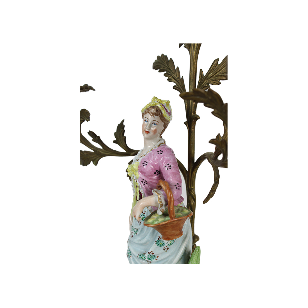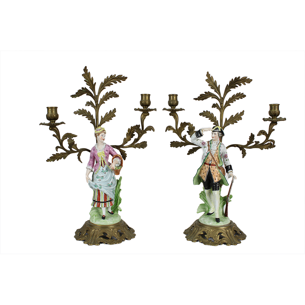 COPPIA DI CANDELABRI in porcellana policroma raffiguranti personaggi con base e porta candele in bronzo dorato manifattura Capodimonte primi 900 h cm 40,5 x 25 x 15