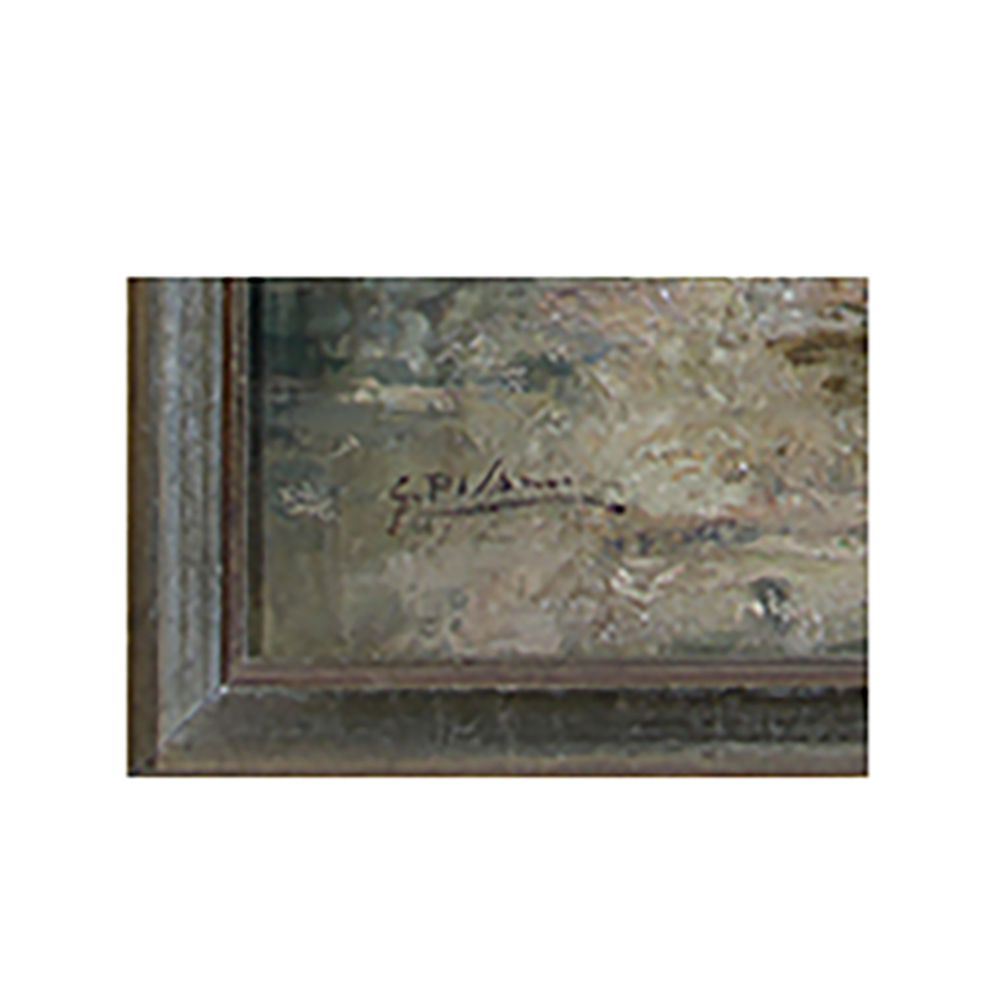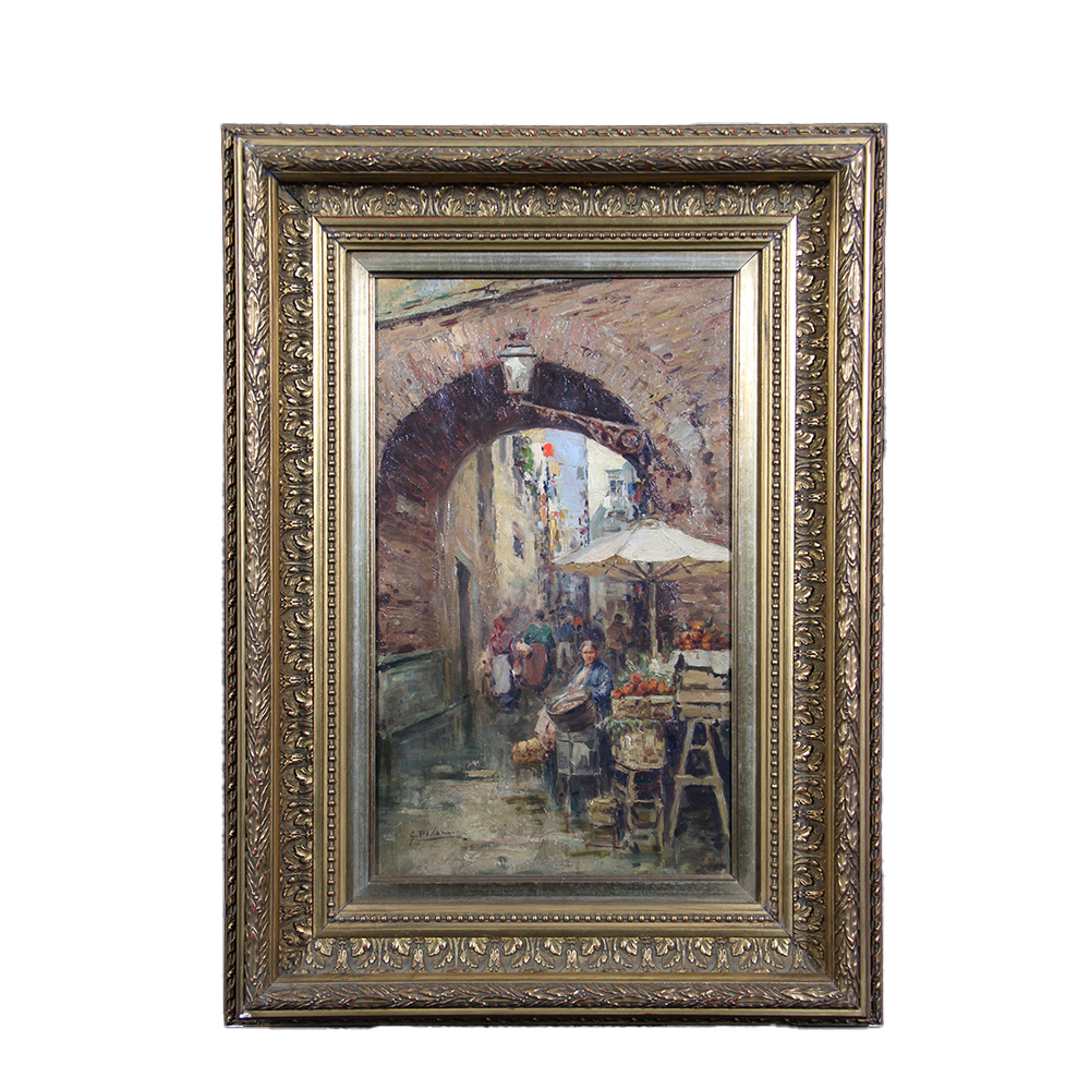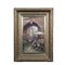 OLIO SU TELA raffigurante scorcio di paese con venditori ambulanti dentro cornice in legno dorato XIX / XX secolo h cm 54 x 32 - cornice h cm 77 x 56,6