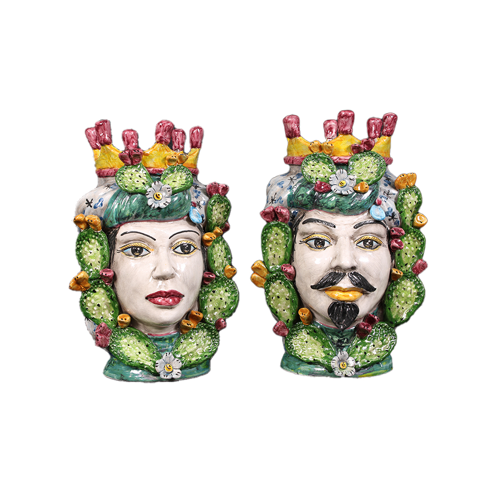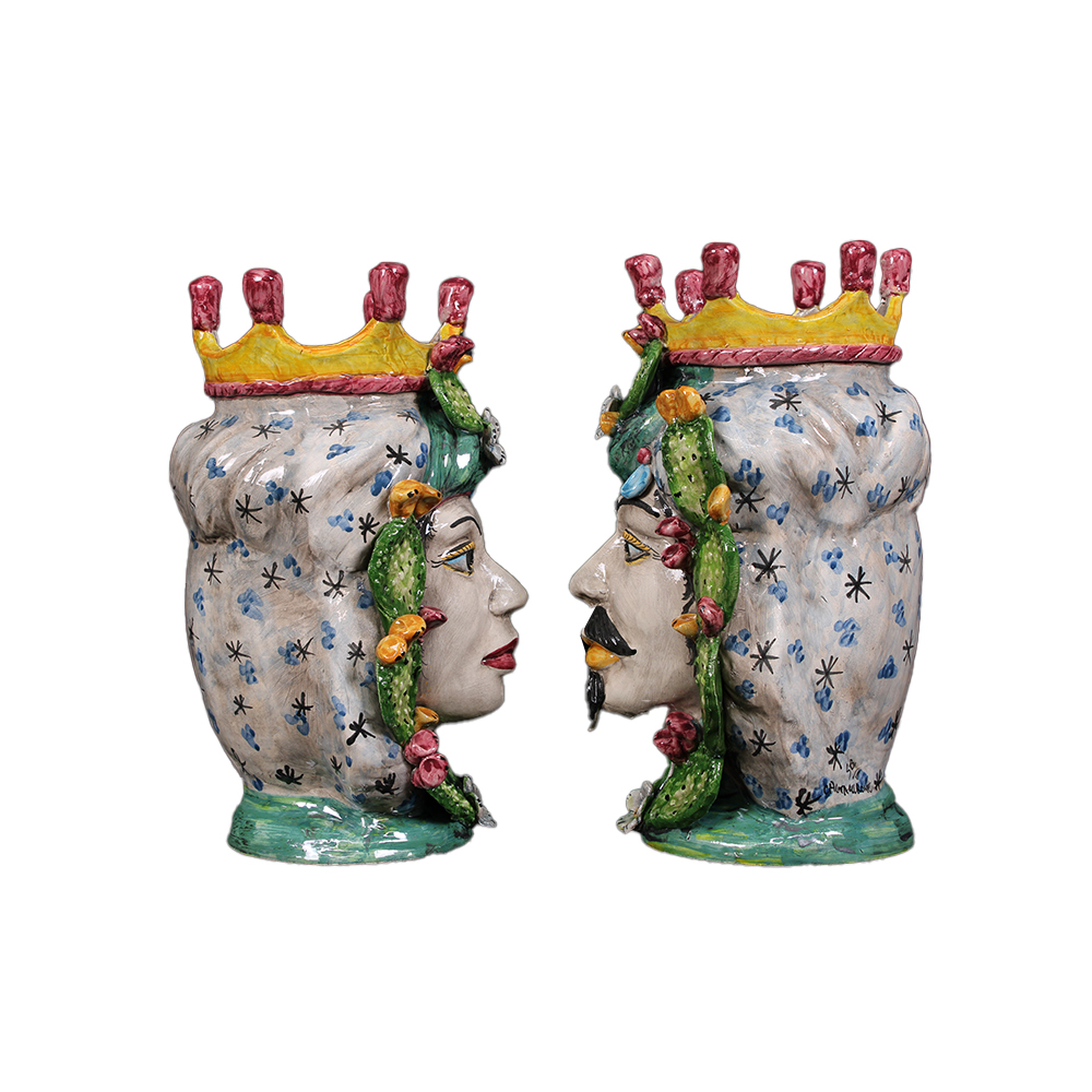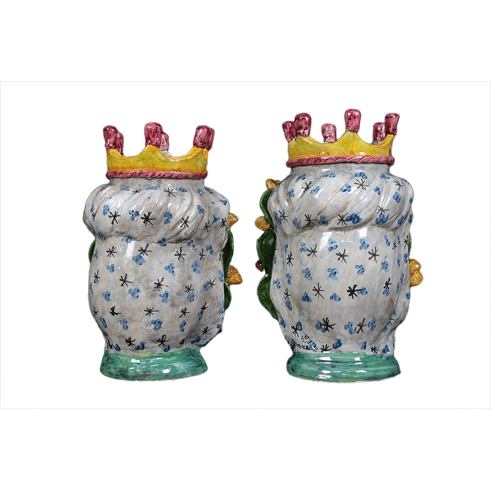 COPPIA DI VASI TESTE DI MORO in maiolica policroma Sicilia vecchia fattura h cm 36 x 21