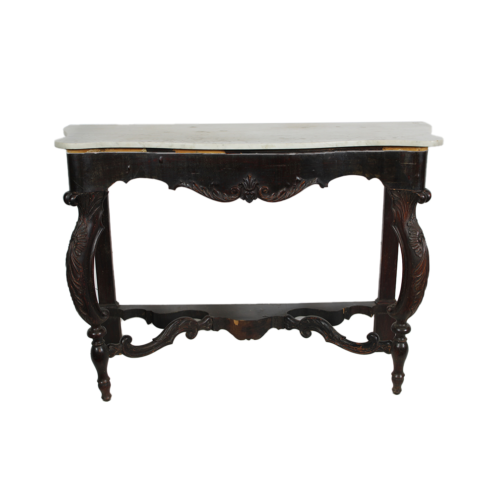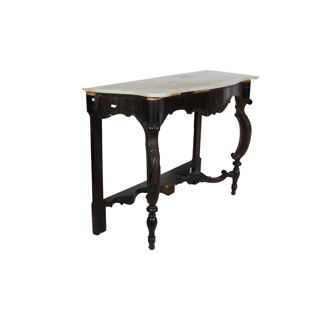 CONSOLLE LUIGI FILIPPO in legno ebanizzato e piano in marmo bianco di Carrara, usure e mancanze del tempo Sicilia XIX secolo h cm 102 x 144 x 58