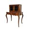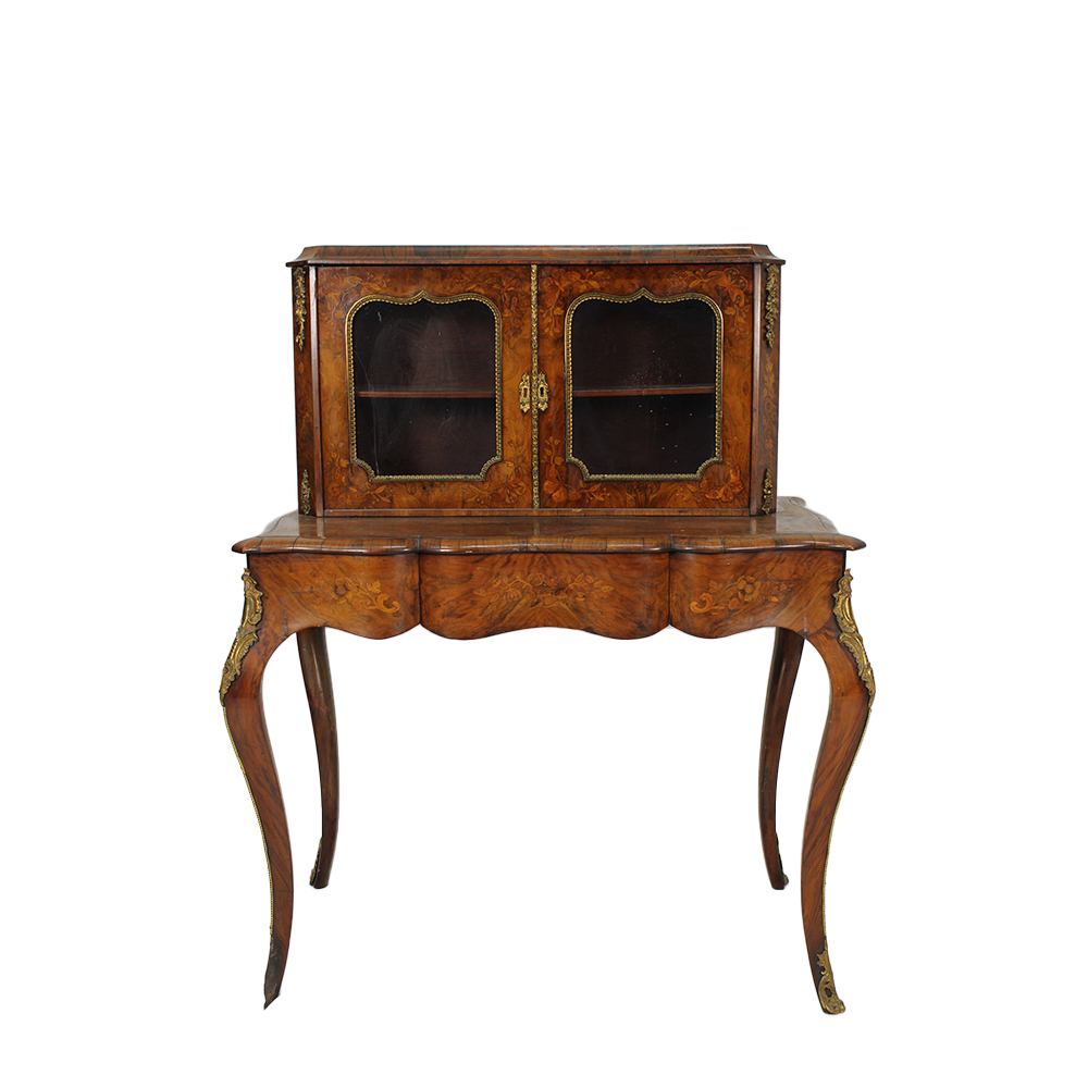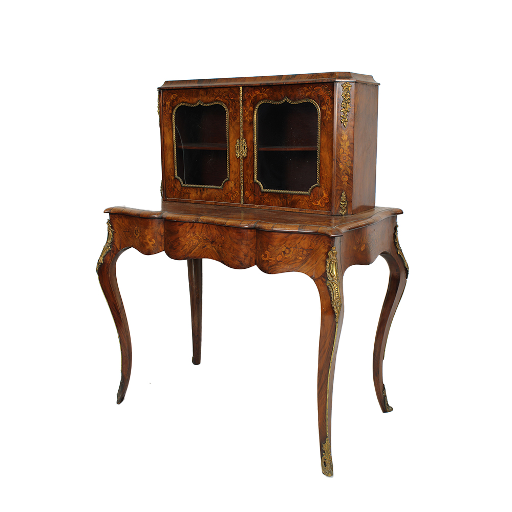 SCRITTOIO CON ALZATA E VETRINA in radica di noce riccamente intarsiato in varie essenze di legno e applicazioni in bronzo dorato Inghilterra XIX secolo h cm 121,5 x 95 x 57