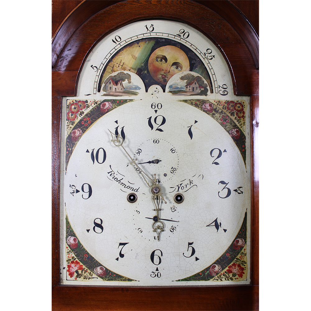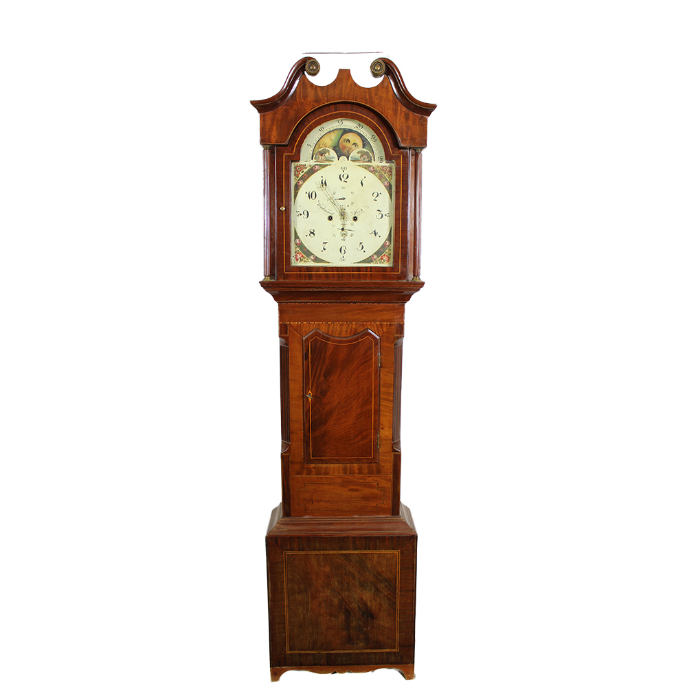 OROLOGIO A TORRE con cassa in legno di mogano e perfili in varie essenze di legno con orologio firmato Ribmond York XIX secolo h cm 225 x 56 x 27