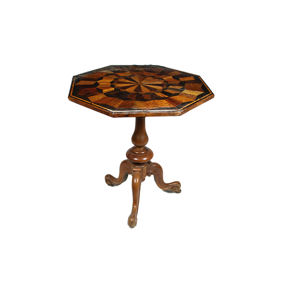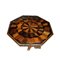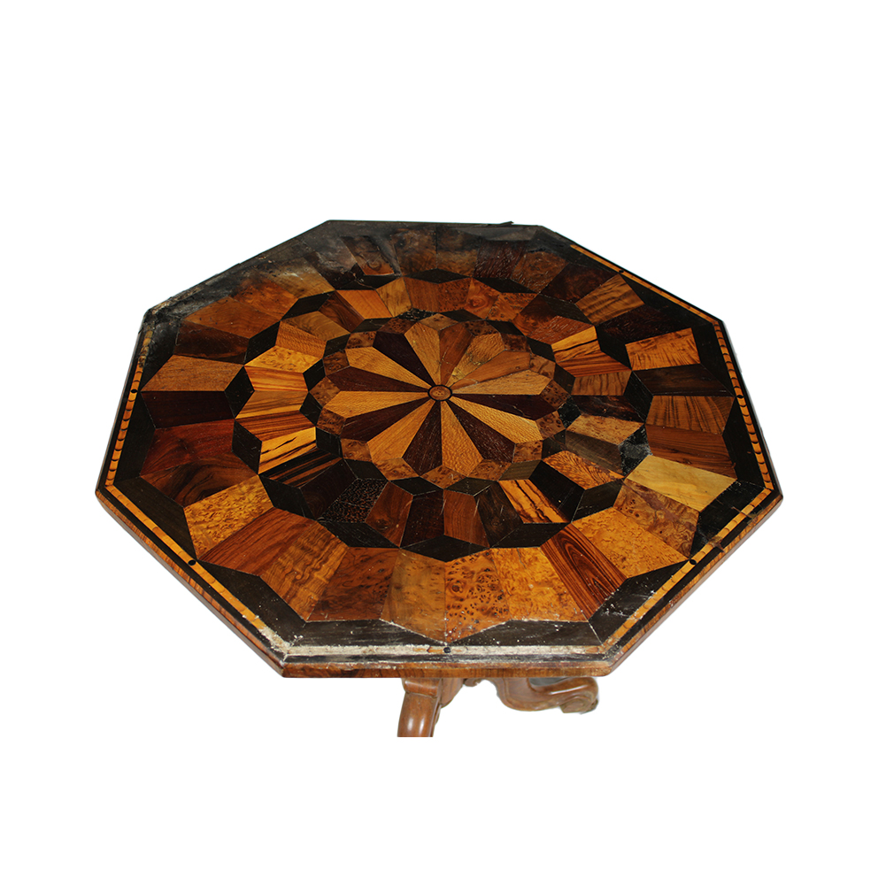 TAVOLINO con piede centrale e piano di forma ottagonale in intarsiato a motivi geometrici di diverse essenze di legno , usure Sicilia primi 800 h cm 65 x 66