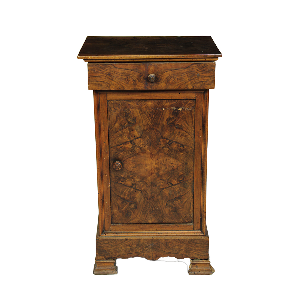 COMODINO in legno di noce e radica di noce con cassetto parte superiore e anta parte inferiore Italia XIX secolo h cm 74 x 42 x 31