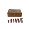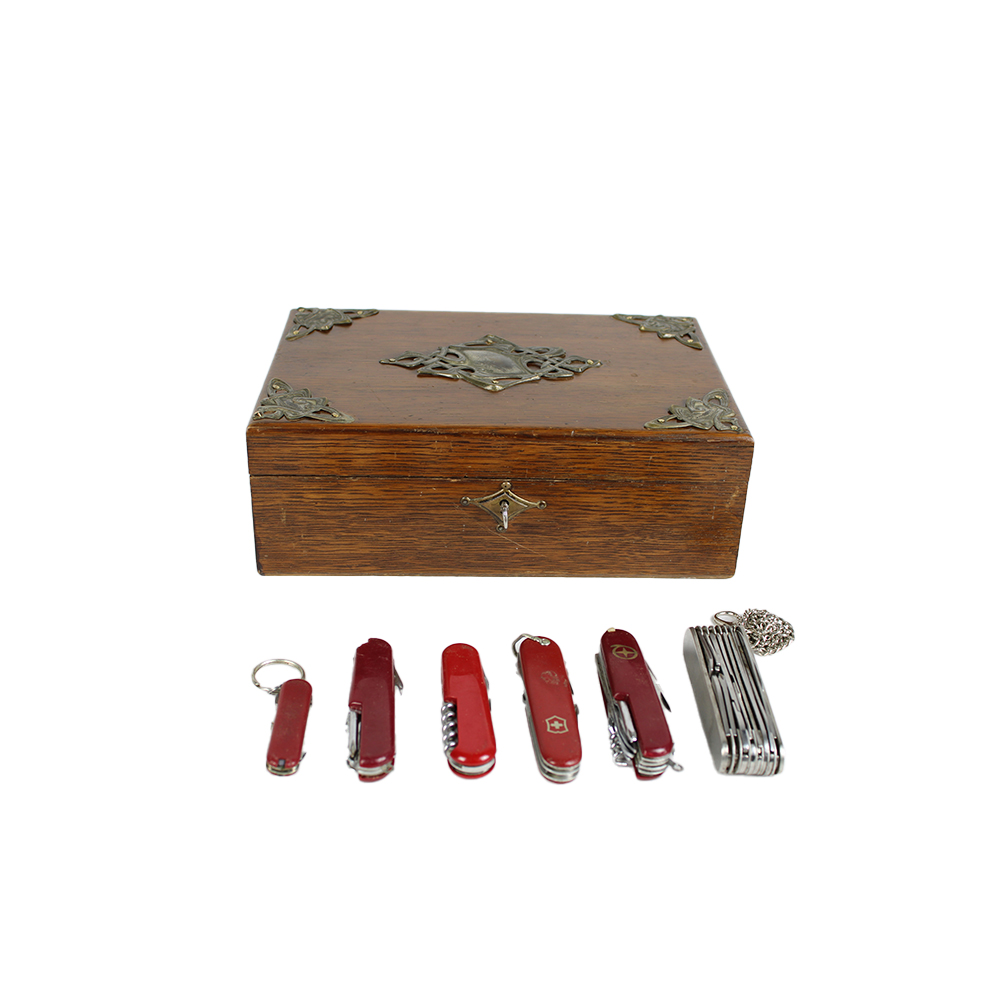 LOTTO COMPOSTO DA scatola in legno di rovere decorata da borchie in metallo e collezione di 6 coltellini svizzeri XX secolo misure varie
