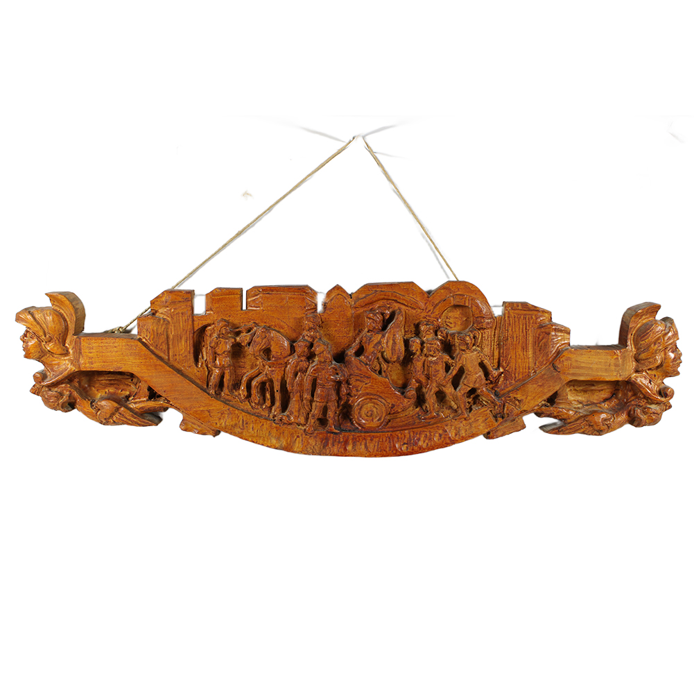 CHIAVE DI CARRETTO in legno scolpito raffigurante soldati con biga maestranze siciliane XX secolo h cm 24 x 89