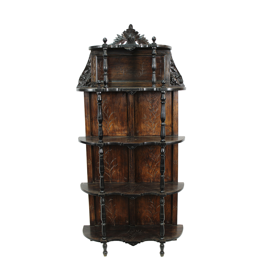 ETAGERE in legno ebanizzato a 5 mensole sorrette da colonne con pannelli incisi a motivi floreali e uccelli Sicilia fine XIX secolo h cm 156 x 73 x 25