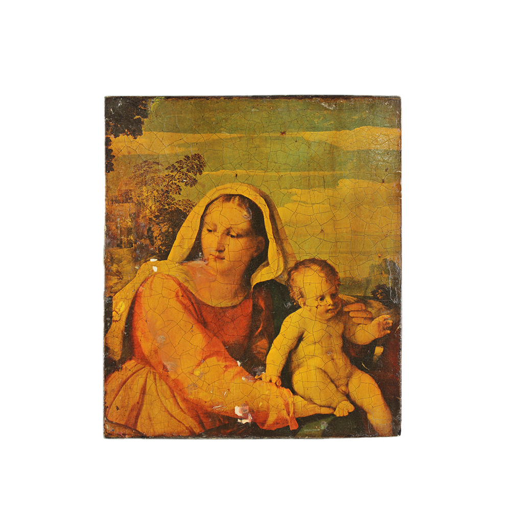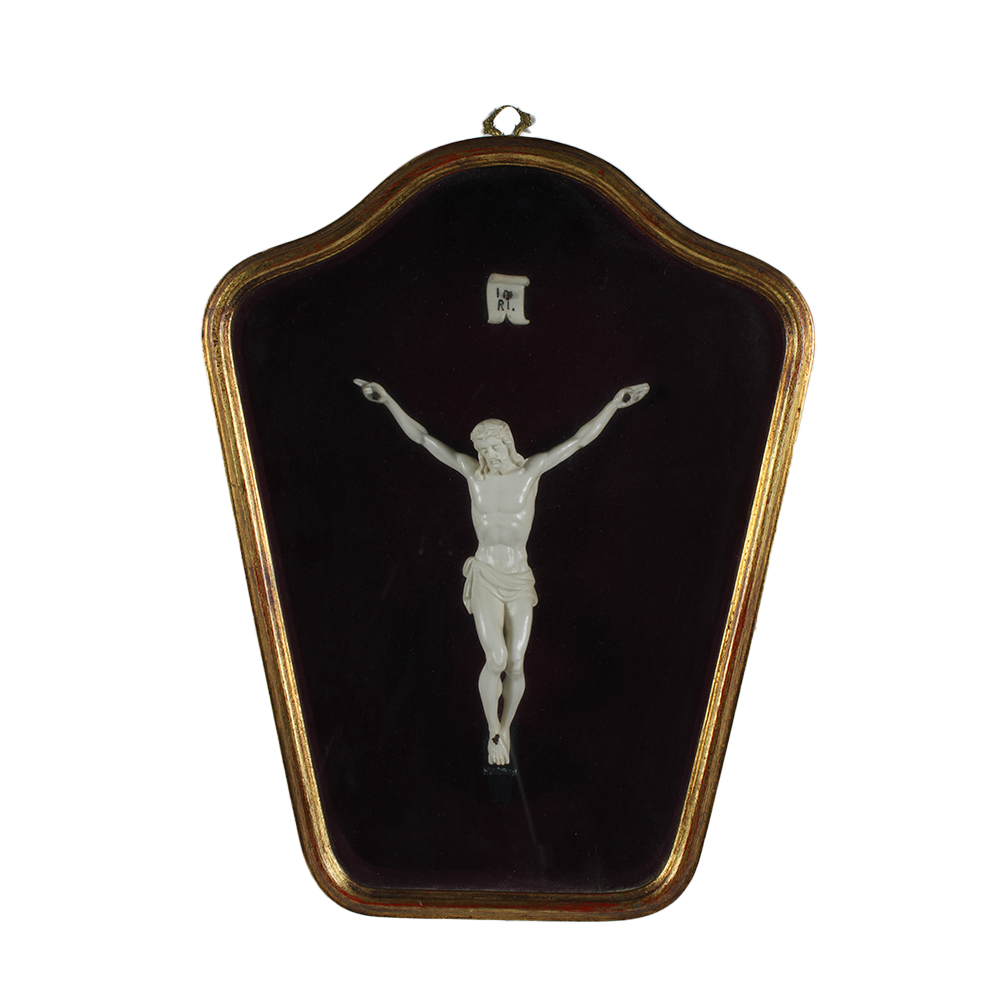 LOTTO COMPOSTO DA 1 crocifisso in biscuit dentro teca e 1 stampa su carta riportata su tavoletta raffigurante Madonna con Bambino primi 900 h cm 39 x 32 x 6 - h cm 28 x 24
