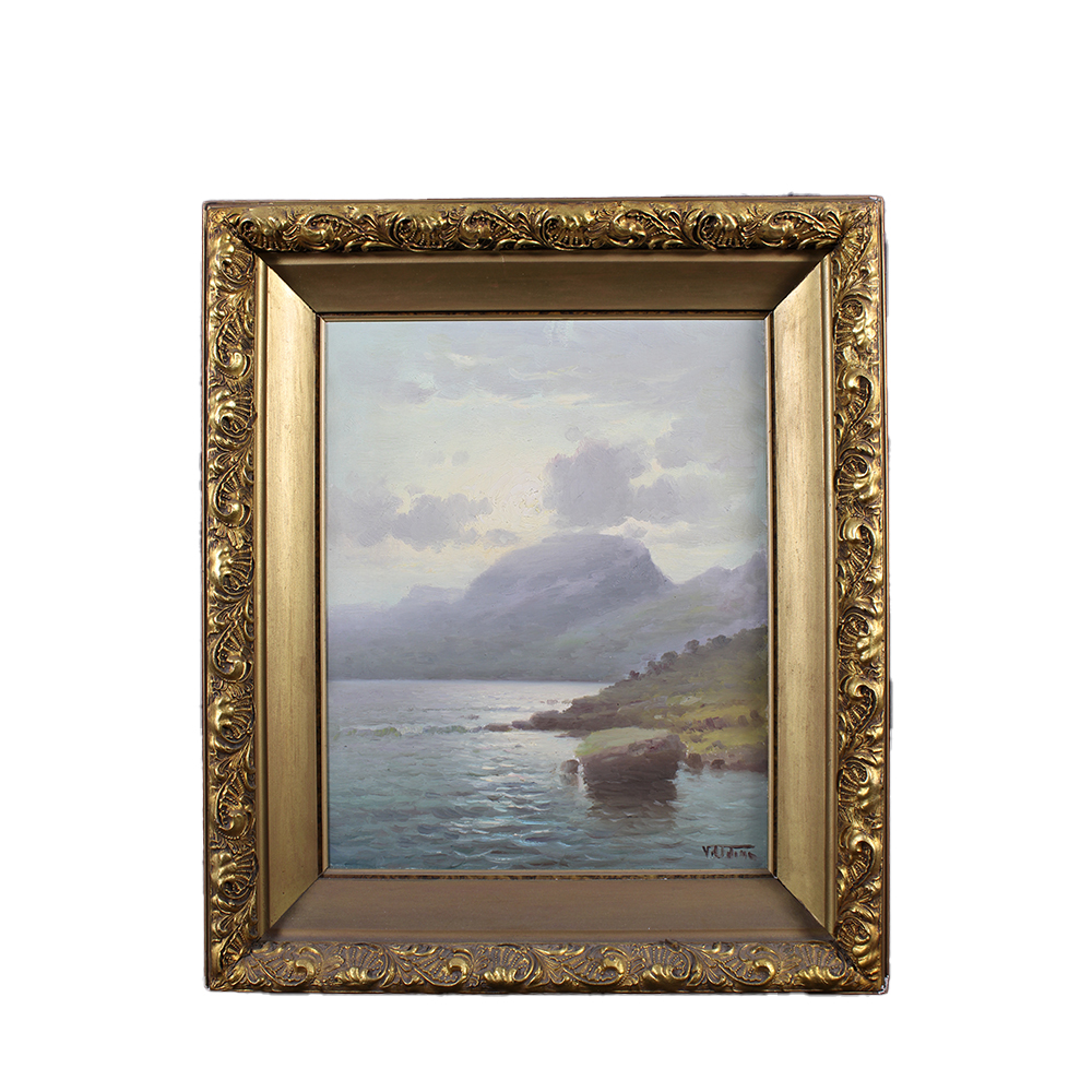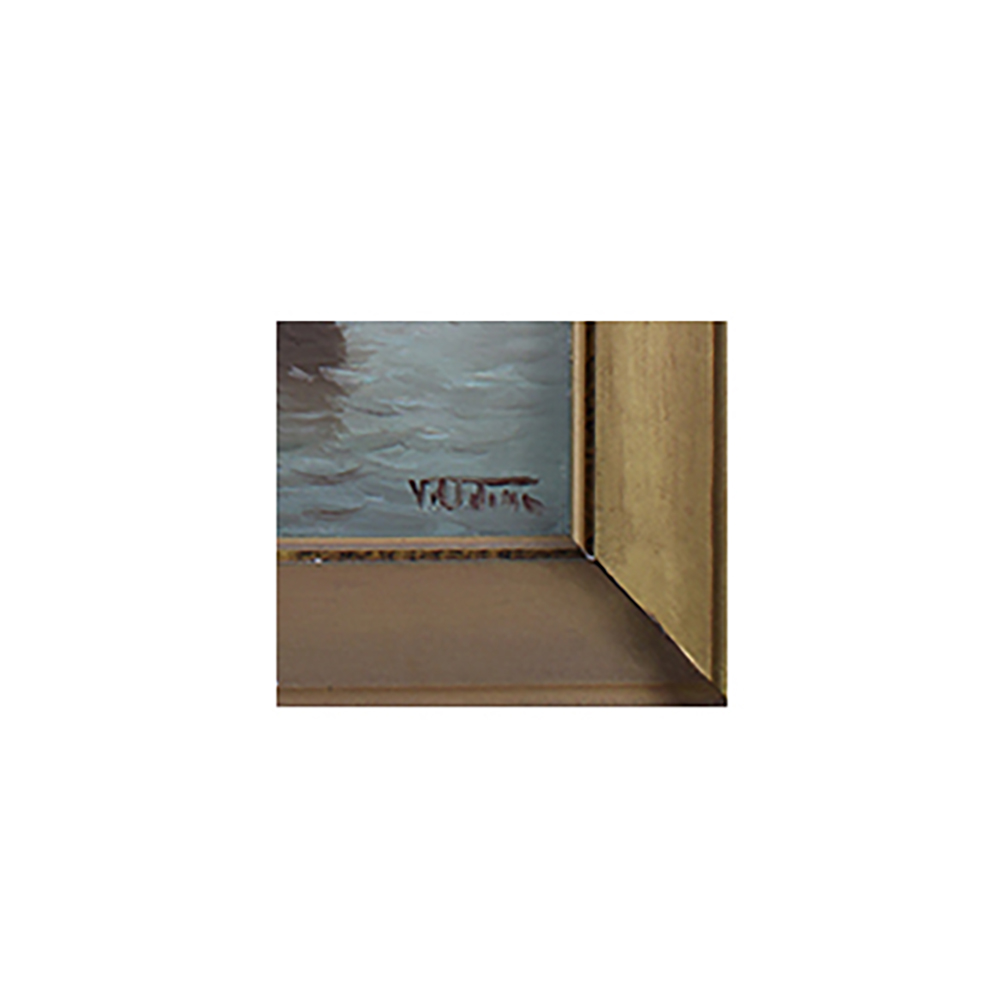 OLIO SU FAESITE raffigurante Veduta marina dentro cornice in legno e pastiglia dorata a firma Vincenzo Udine (Palermo 1898-1981) Sicilia h cm 55 x 45 - cornice h cm 72 x 62